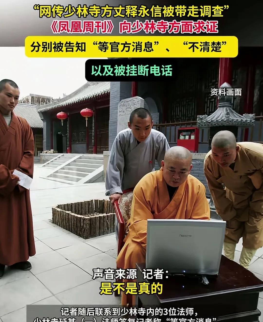 看了凤凰周刊采访少林寺法师的新闻,三位法师(也有说工作人员)的回答,令人遗憾,没有一个敢正面回答释永信被带走的传闻! 第一个法师反复表示,等官方消息! 第二个法师说自己在外面学习,不了解! 第三个法师直接挂断电话。 没有肯定,但也没有否定。 有一点可以确定,这件事也让少林寺不再是佛门清静之地。 我们确实应该等待官方消息,不去妄加非议。 我只想说,人性和人心都是复杂的,看待事物,也要学会从多种立场不同角度去分析。 少林寺发展到今天,不是一个人可以做到的。 是是非非,逃脱不了红尘。