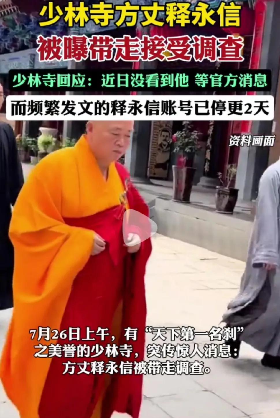 释永信不是真和尚,真实的身份是董事长,历史的笑话! 华丽的袈裟下面,藏着的不是普度众生的心,而是一股铜臭味! 网曝被带走,寺庙回应近日未看到,等官方消息! 中国寺庙,己是千古一变,和尚己不再是传统文化中四大皆空,普度众生的和尚,而演变成了董事长和职员的寺庙,和尚已经变成了假和尚,寺庙就是一个壳。 释永信被查是迟早的事,少林寺的真实名称其实就是“河南少林无形资产管理有限公司”,曾经释永信占80%的股份,释永信就是靠着方丈的名份,实际上是大老板的身份。 而少林寺的资产并不是少林寺的和尚投资生产的,而是香客的心愿捐赠,释永信哪有资格当这个老板,被查迟早的事。 和尚在金钱美女面前,很容易变成俗里俗气的花和尚,现在寺庙里的和尚,有几个是虔诚的信徒,大都是冲着钱去的,去发家致富的。 豪车、网红、和美女合影、去外国高调活动,网传外国资产,和尚打假势在必行!#少林寺释永信# #释永信# #少林和尚#