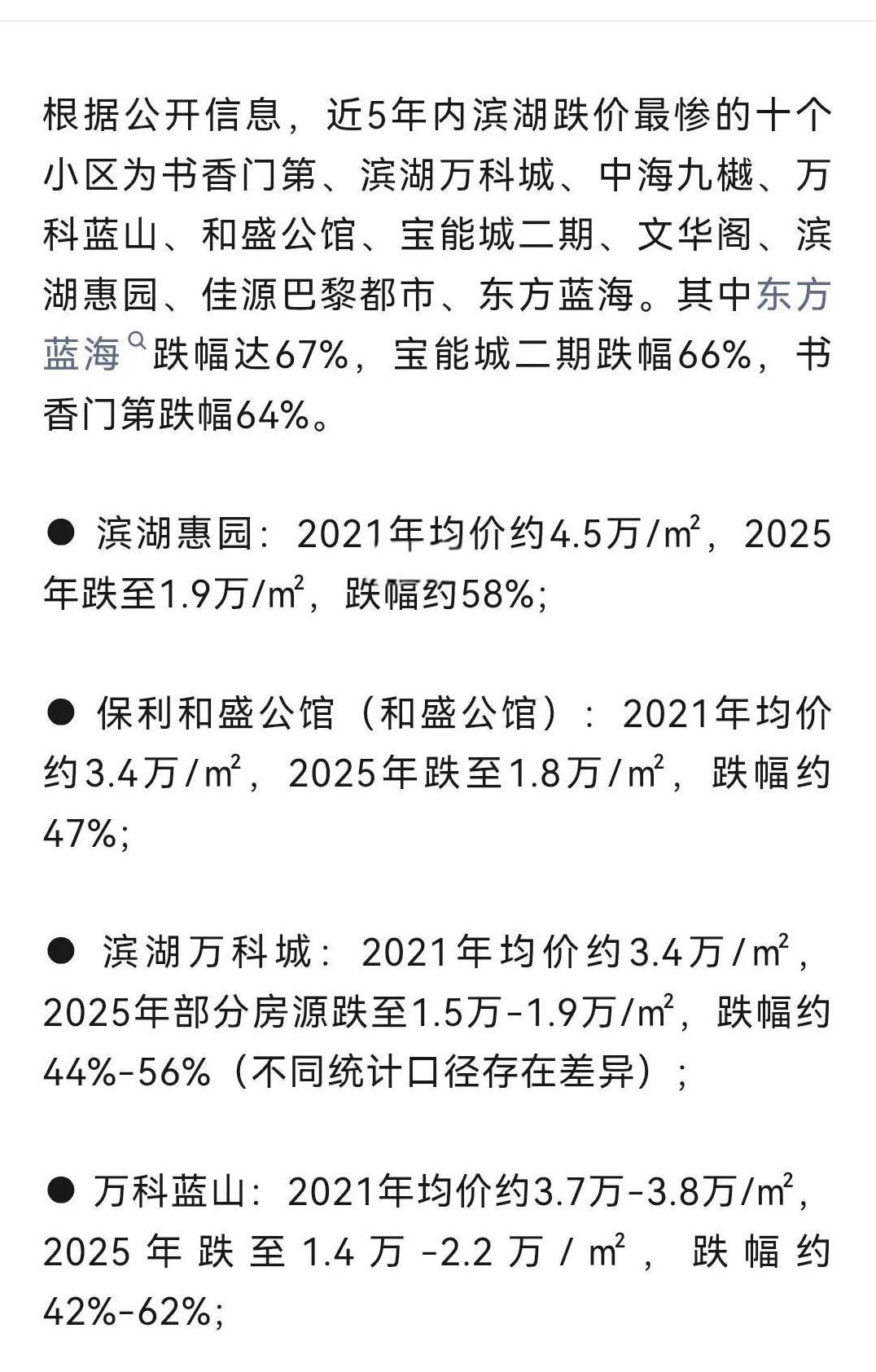 合肥滨湖新区房价下滑最猛的十个小区。基本都是打了五折以上。这个统计应该不完全,滨湖金融板块,环湖板块,那边下滑的也不少。但是相比较滨湖很多小区开盘的价格,七八千一平,这个价格还是涨了。 只是后面很多买新房的,地价按二手房行情来,很多新房就很贵。