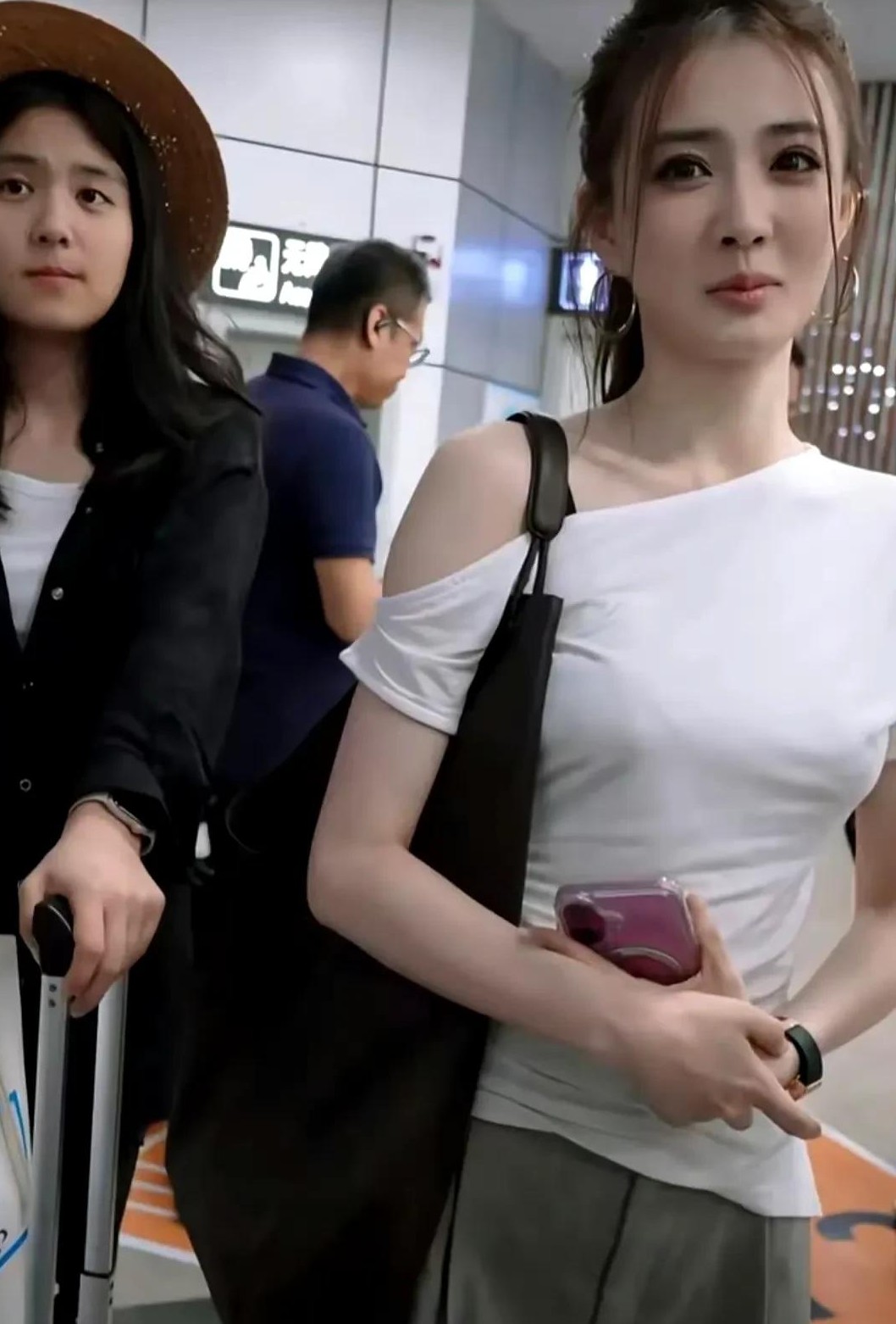 徐璐机场路透图直接封神,长得也太水灵了,穿斜肩白T恤简单减龄,高扎马尾活力四射,