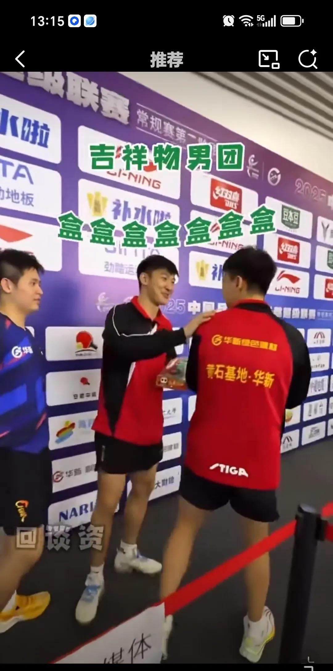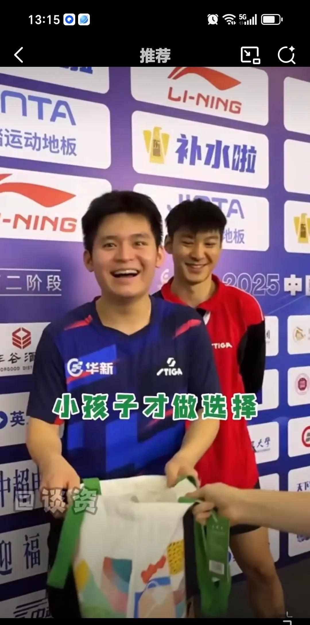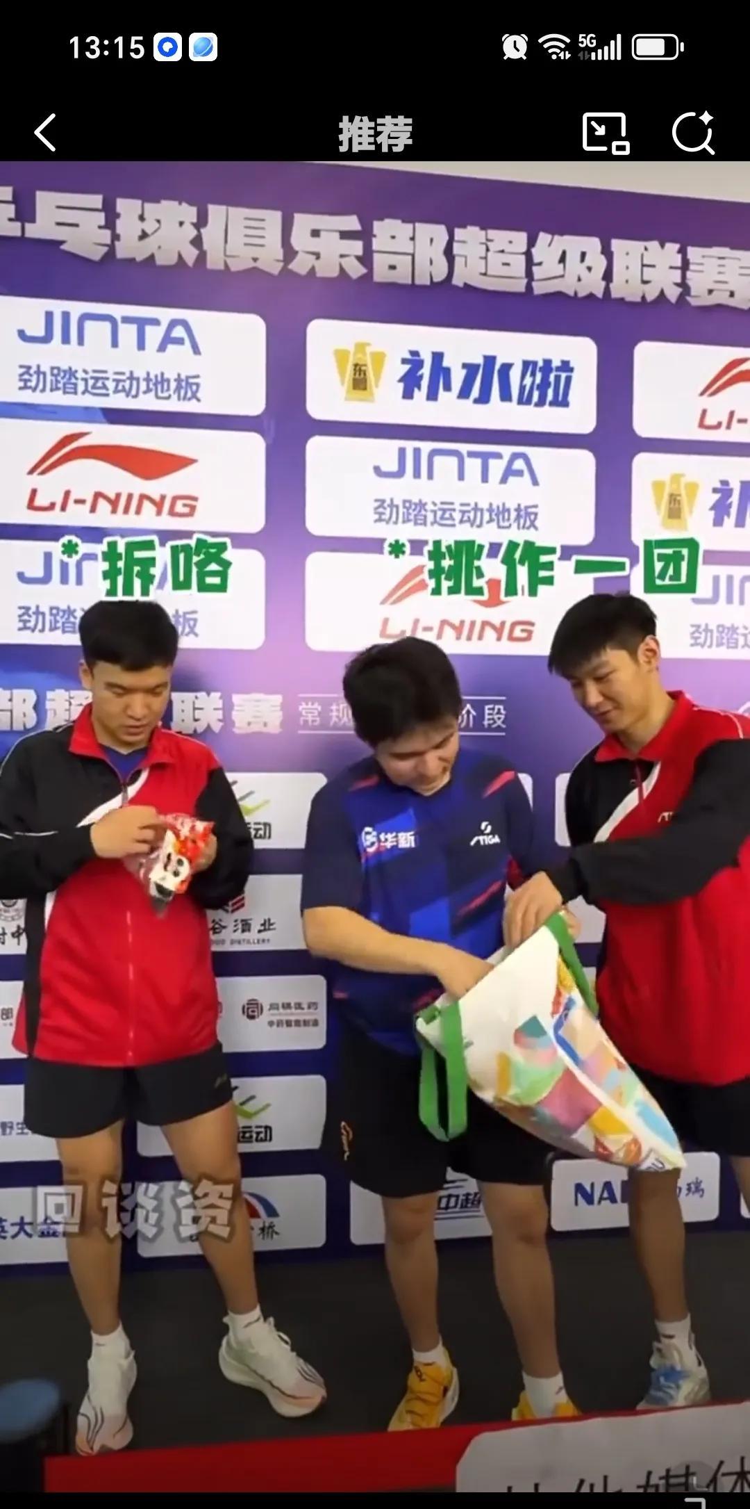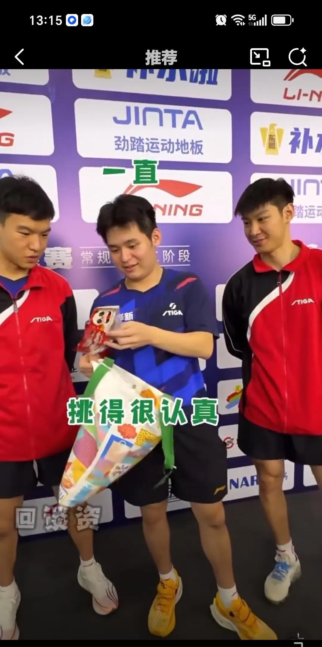 7月26日林诗栋乒超的快乐我们不懂,在采访区选吉祥物,他把袋子都拿走,成年人不做
