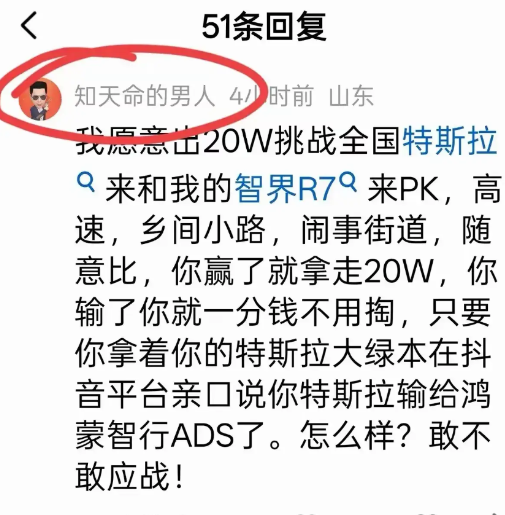 智界r7车主不服懂车帝,向特斯拉车主提出挑战。 近日,特斯拉在懂车帝的高速事故模