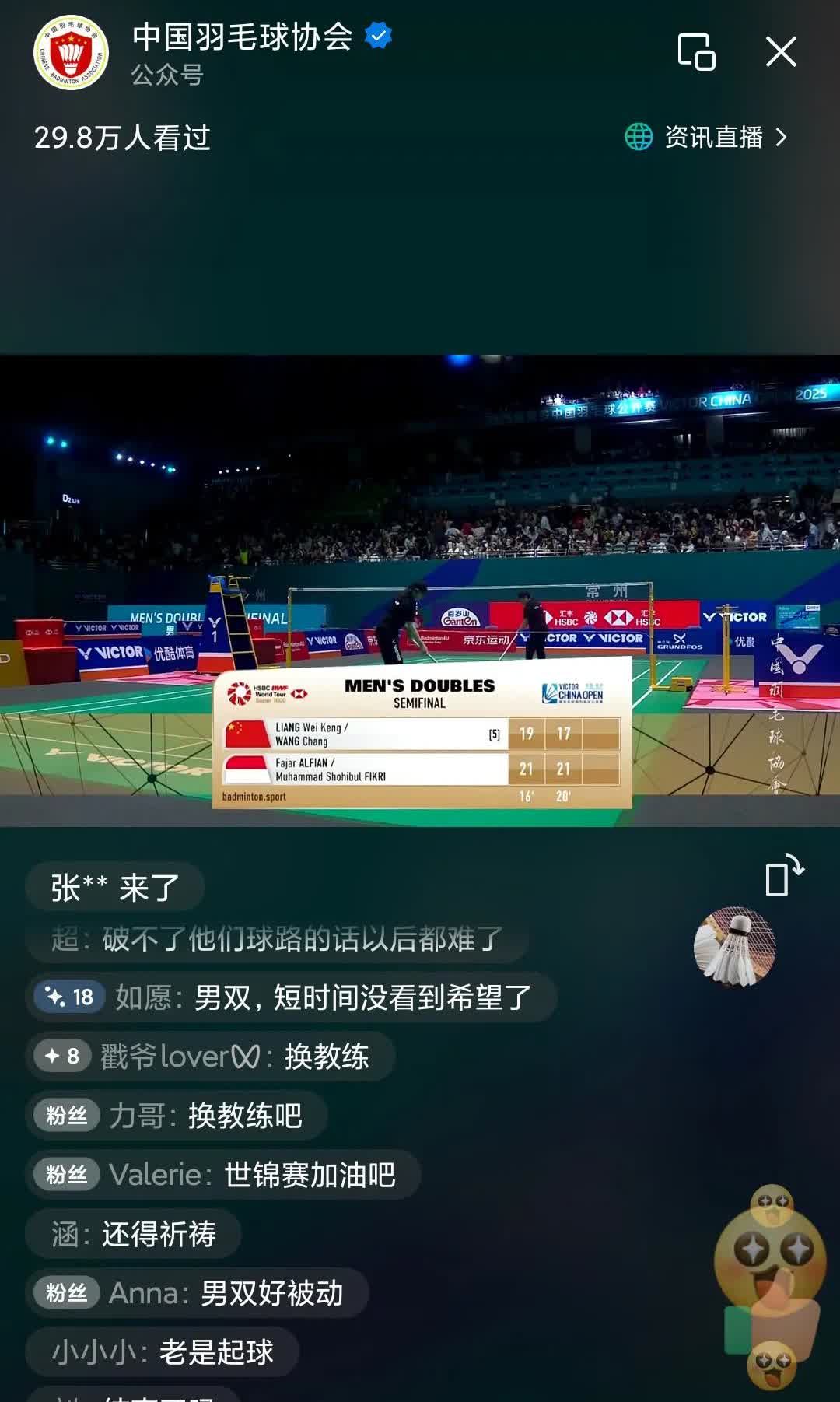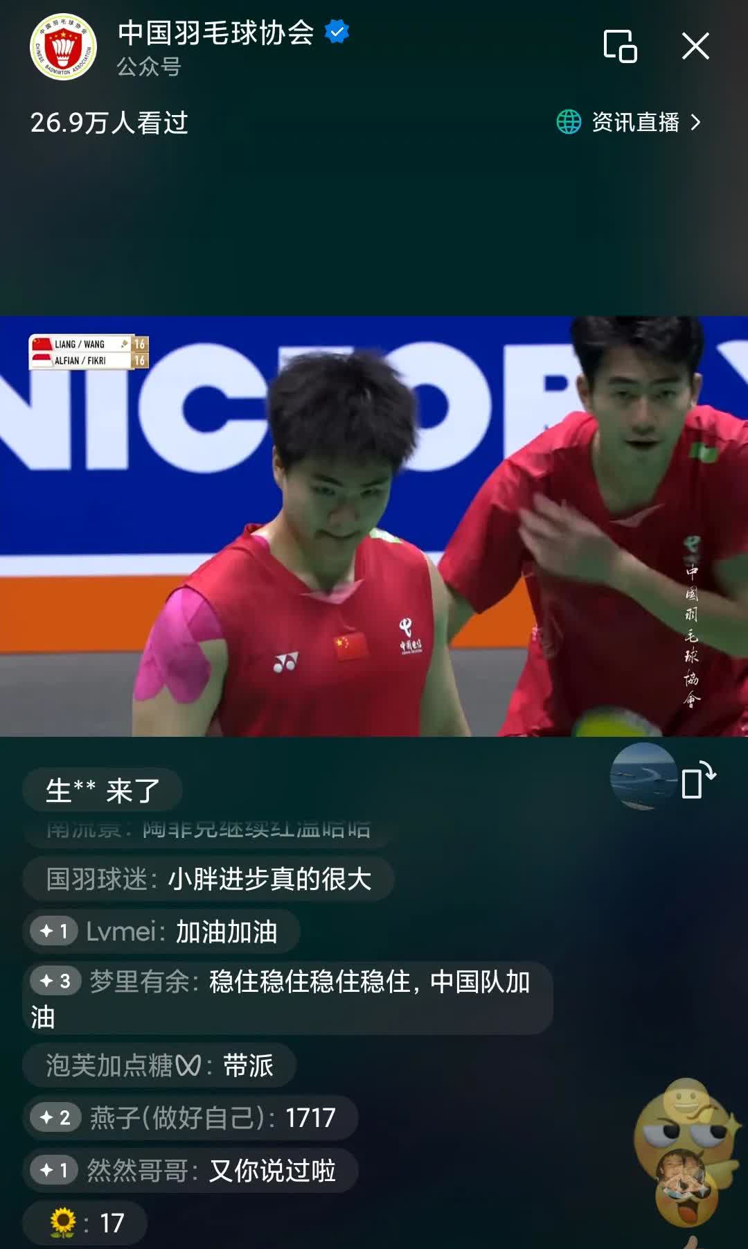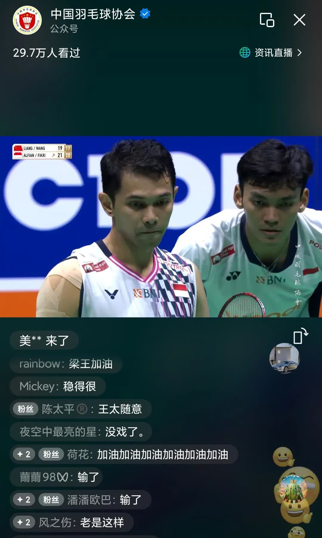 今天第一次平静地看完梁王比赛。 默默地看他们输完第一局,又毫无悬念也输完第二局,0:2(19:21 17:21)不敌印尼临时组合阿尔菲安/菲克里,无缘决赛。 心如止水… 以往,看到他们比分落后,我总是心急如焚;看他们失误百出,我总是唉声叹气;看他们慵懒随意,我总是气急败坏! 其实心静下来一看,梁王真的不值得期待,防守一般,进攻一般,发接发一般,中前场一般,速度连贯也一般,拼劲更一般,而失误却超多,这样的组合八强已经是最好的定位了! 明日男双冠亚军又是一如既往花落别家,但可喜可贺我们的男单女双混双3金3银稳稳当当,不能一锅饭都给端了,谁还跟我们玩呢!你说对不对?