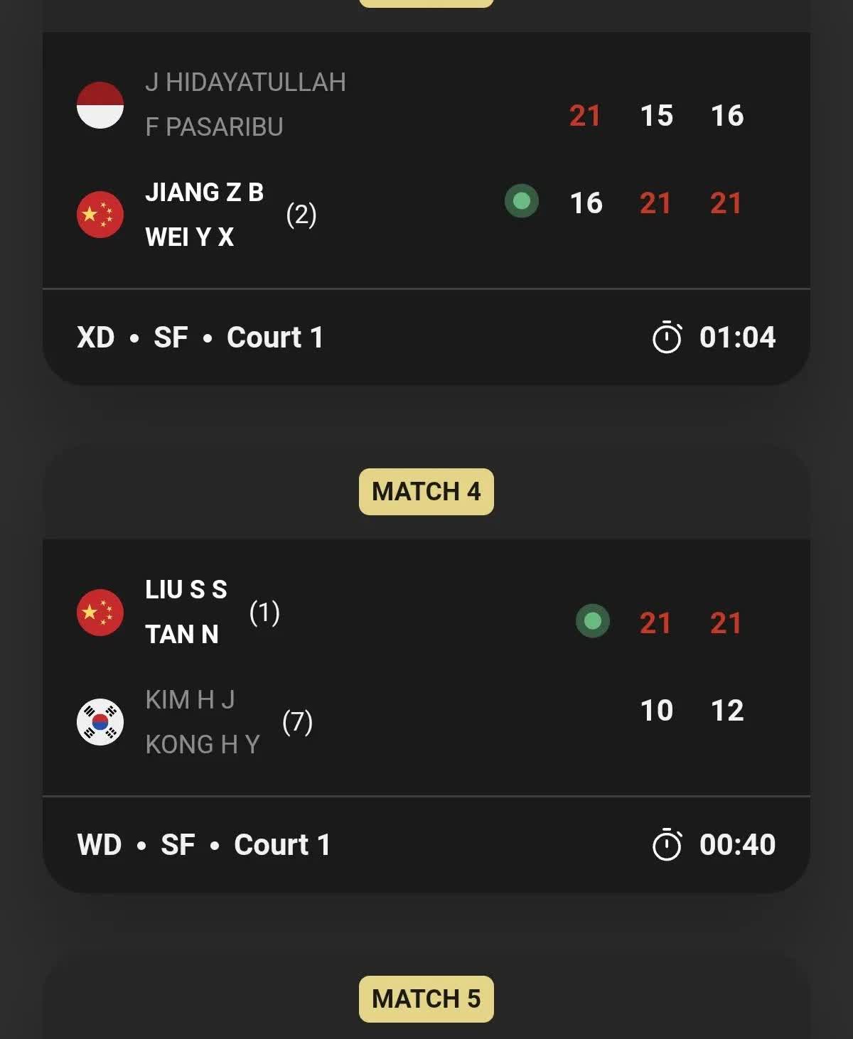 国羽在2025公开赛半决赛上表现很好 上午五场比赛,国羽全部获胜,已经提前包揽