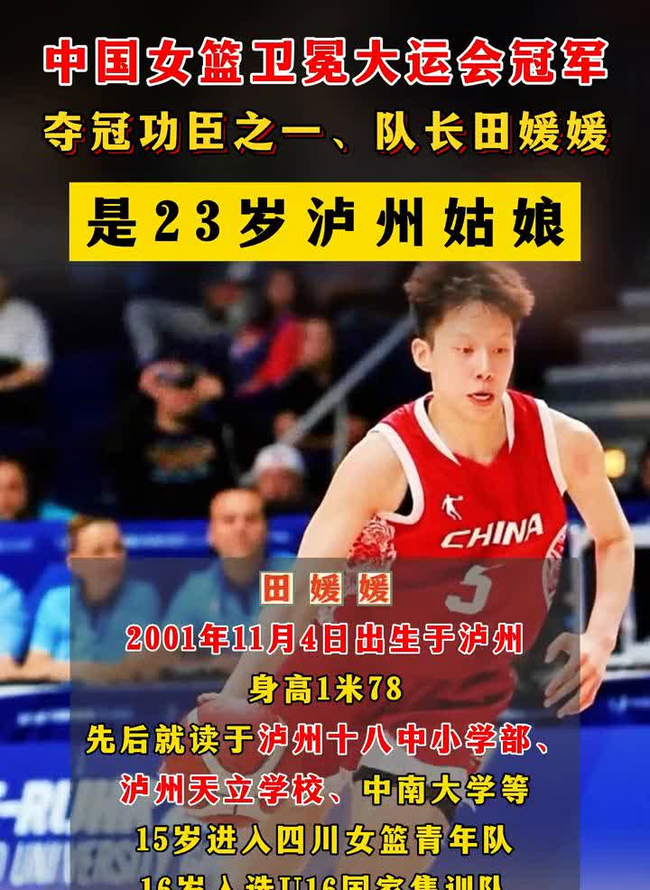 中国女篮卫冕大运会冠军,夺冠功臣之一、队长田媛媛是23岁泸州姑娘。 当地时间7