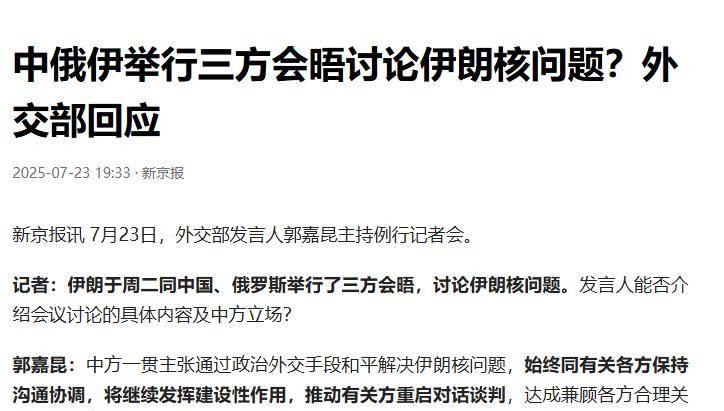 如果说外交部的声明是给美国定了规矩,那么接下来,中国的行动则是直接把美国的棋盘给掀了。就在7月22日,一条来自德黑兰的新闻震惊了全球:中俄伊三方代表齐聚一堂,正式开始商讨合作。这一系列的动作犹如精心策划的反击。