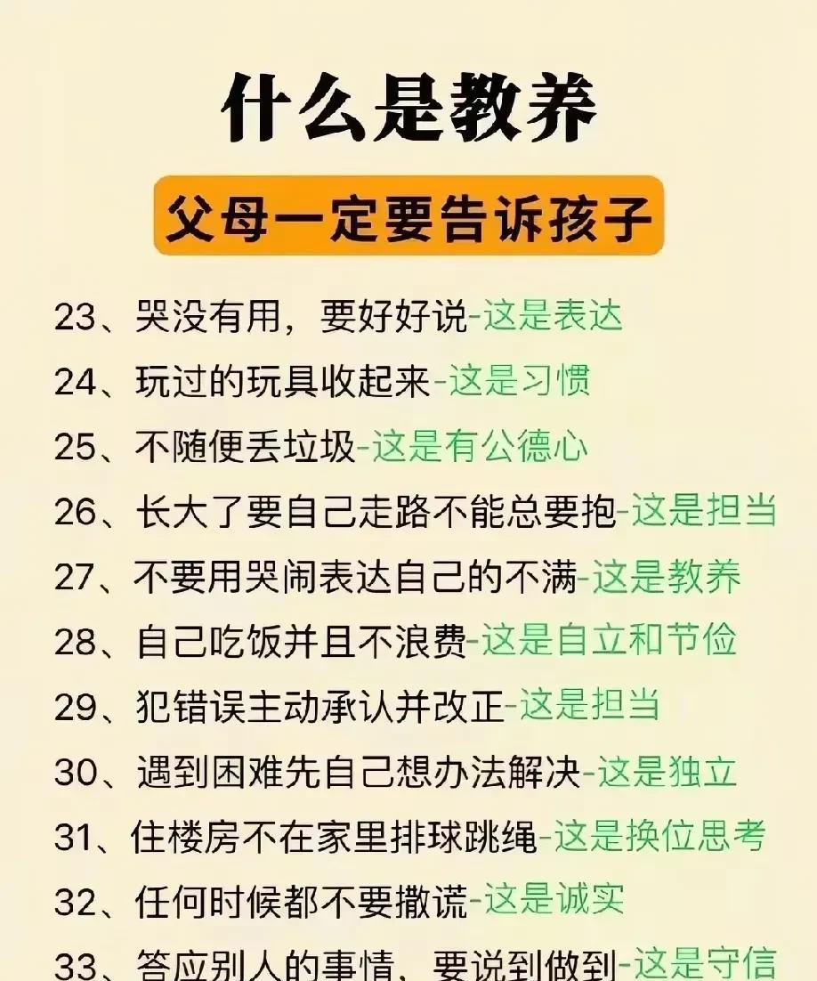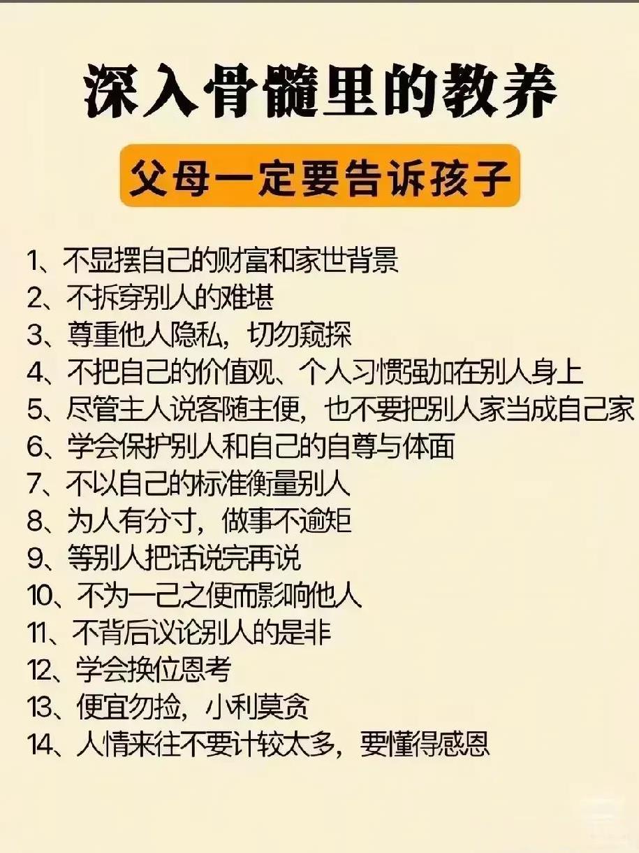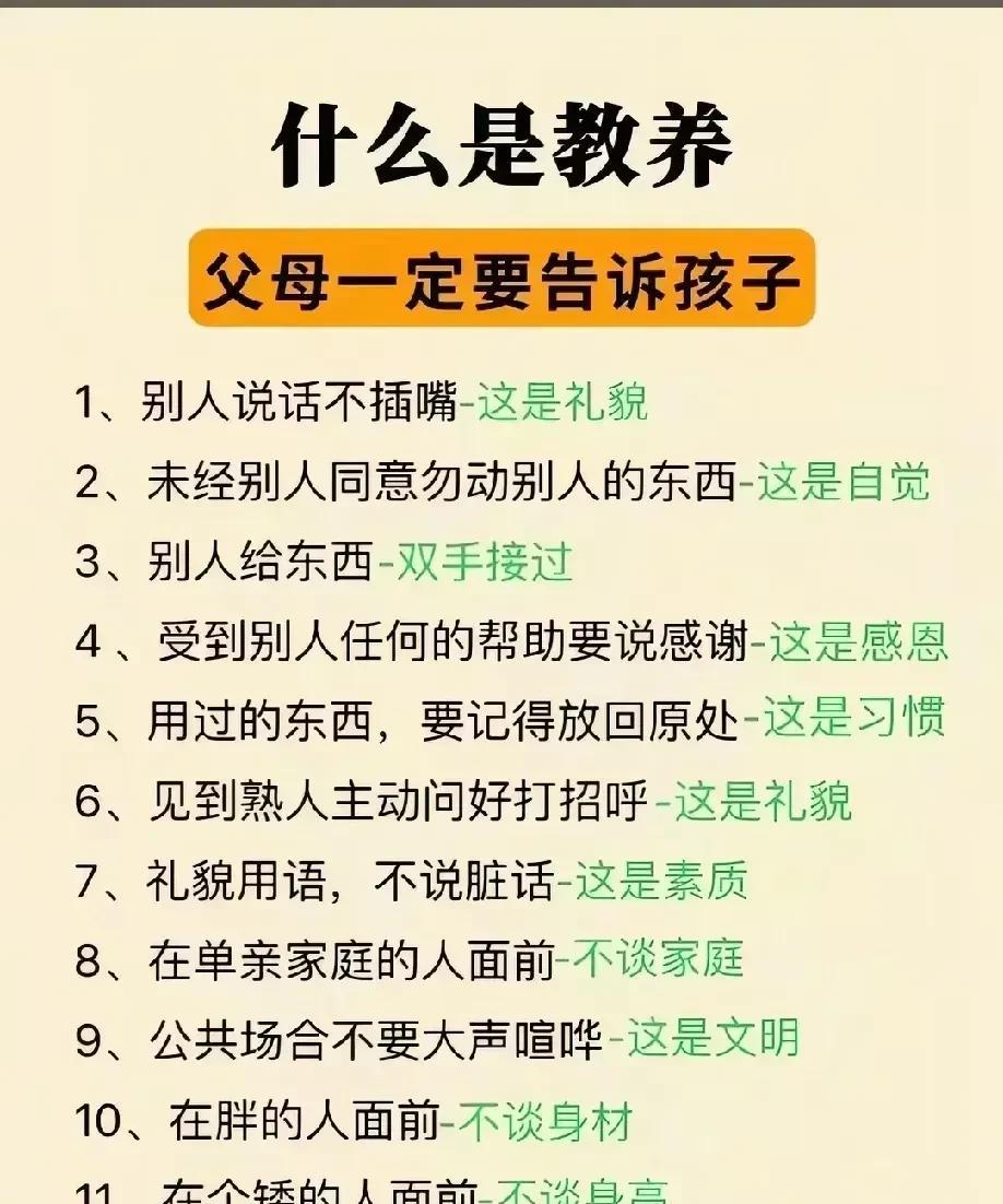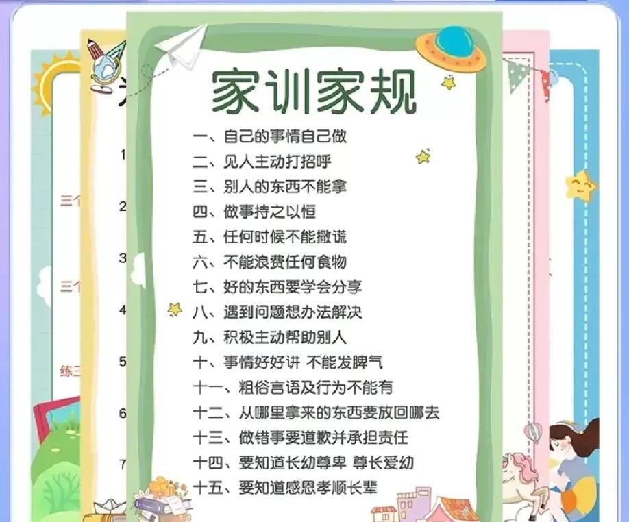 博士后妈妈真有一套,把什么是家规家训,什么是深入骨髓的教养,什么是餐桌礼仪给说清楚了!博士妈妈凭借立家规家训教育培养出了三个985孩子!看完后真的被惊艳到了!趁着孩子低年级,早立规矩,孩子早开窍!有规有矩家庭才兴旺,成功离不开规矩呀! 惯子如杀子!不少独生子女被长辈溺爱,在家都是小公主小王子,孩子吃饭敲碗、顶嘴、写作业拖拉,说多少遍都不改,把家长都愁坏了!人们都说,没有规矩不成方圆,那么问题来了,什么是家规家训? 简单来说,家规家训是家庭传承的行为准则,约束规范成员言行;深入骨髓的教养是刻在骨子里的品德,体现在日常细节;餐桌礼仪是用餐时的行为规范,彰显家教与尊重。那么普通家庭如何“低成本立规”? 从“一个规矩”开始:别追求完美,先选一个最痛点(如吃饭敲碗),坚持21天形成习惯,再逐步扩展。用“仪式感”强化:妈妈设计了“家规勋章”——孩子连续一周遵守规则,可获得一枚刻有名字的铜牌,挂在卧室激励自己。最重要的是全家“共同执行”:爸爸也需遵守(如不在孩子面前刷手机),否则孩子会质疑:“为什么你们不用守规矩?” 家规不是“别人家的神话”,而是每个家庭都能复制的“教养工具”。当孩子学会在餐桌上尊重他人、在责任中学会担当、在错误中成长时,他们收获的不仅是985的录取通知书,更是未来立足社会的底层能力。 博士后妈妈立下的家规家训,值得大家参考借鉴,尤其是那些家里有熊孩子。不读书,不自律,唱反调的,可以把家规家训打印出来贴在墙上,让孩子每天读一读背一背,吾日三省吾身,培养出“眼里有光、手中有礼、心中有界”的教养。记住,低年级是立规矩的黄金期,现在不管,未来社会会替你管! 【全套5张】家规家训挂图 孩子自律习惯养成期 教育语录