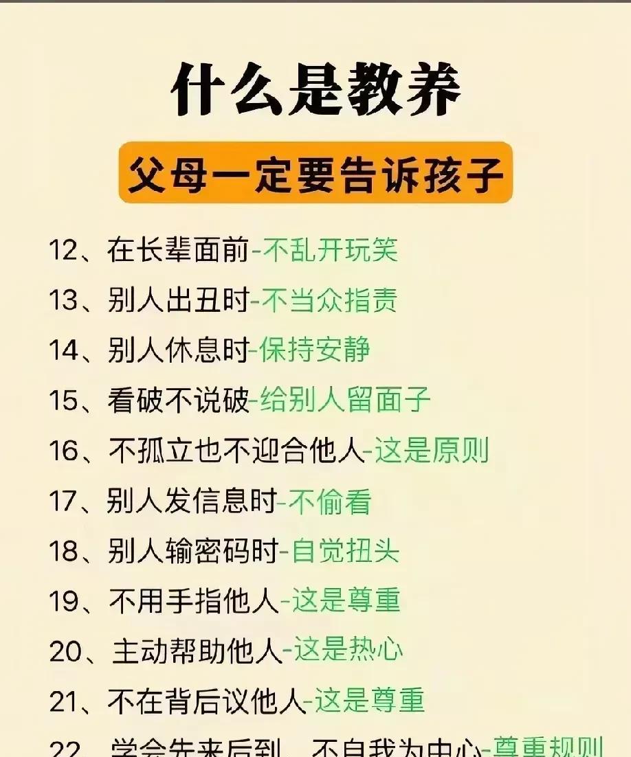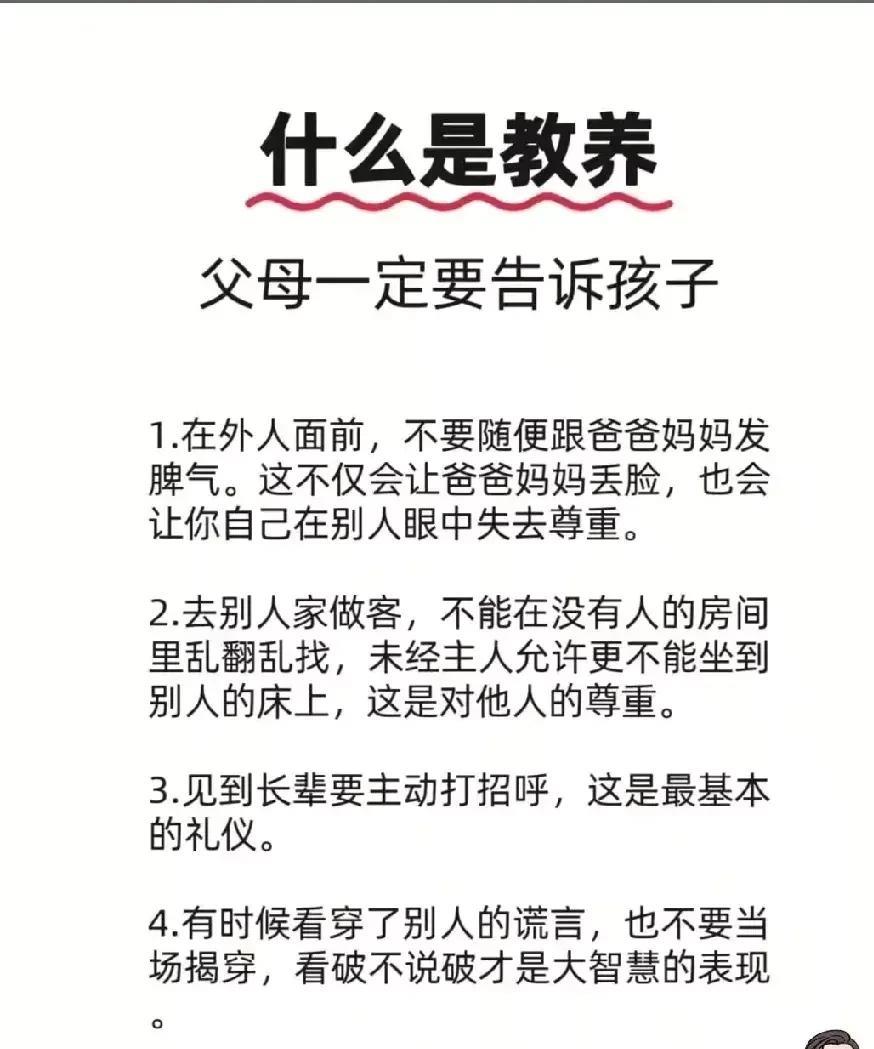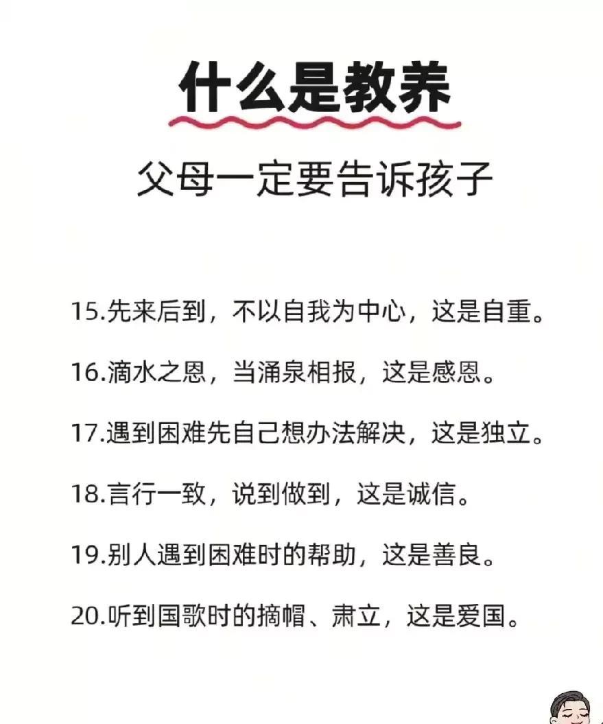 博士后妈妈真有一套,把什么是家规家训,什么是深入骨髓的教养,什么是餐桌礼仪给说清楚了!博士妈妈凭借立家规家训教育培养出了三个985孩子!看完后真的被惊艳到了!趁着孩子低年级,早立规矩,孩子早开窍!有规有矩家庭才兴旺,成功离不开规矩呀! 惯子如杀子!不少独生子女被长辈溺爱,在家都是小公主小王子,孩子吃饭敲碗、顶嘴、写作业拖拉,说多少遍都不改,把家长都愁坏了!人们都说,没有规矩不成方圆,那么问题来了,什么是家规家训? 简单来说,家规家训是家庭传承的行为准则,约束规范成员言行;深入骨髓的教养是刻在骨子里的品德,体现在日常细节;餐桌礼仪是用餐时的行为规范,彰显家教与尊重。那么普通家庭如何“低成本立规”? 从“一个规矩”开始:别追求完美,先选一个最痛点(如吃饭敲碗),坚持21天形成习惯,再逐步扩展。用“仪式感”强化:妈妈设计了“家规勋章”——孩子连续一周遵守规则,可获得一枚刻有名字的铜牌,挂在卧室激励自己。最重要的是全家“共同执行”:爸爸也需遵守(如不在孩子面前刷手机),否则孩子会质疑:“为什么你们不用守规矩?” 家规不是“别人家的神话”,而是每个家庭都能复制的“教养工具”。当孩子学会在餐桌上尊重他人、在责任中学会担当、在错误中成长时,他们收获的不仅是985的录取通知书,更是未来立足社会的底层能力。 博士后妈妈立下的家规家训,值得大家参考借鉴,尤其是那些家里有熊孩子。不读书,不自律,唱反调的,可以把家规家训打印出来贴在墙上,让孩子每天读一读背一背,吾日三省吾身,培养出“眼里有光、手中有礼、心中有界”的教养。记住,低年级是立规矩的黄金期,现在不管,未来社会会替你管! 【全套5张】家规家训挂图 孩子自律习惯养成期 教育语录
