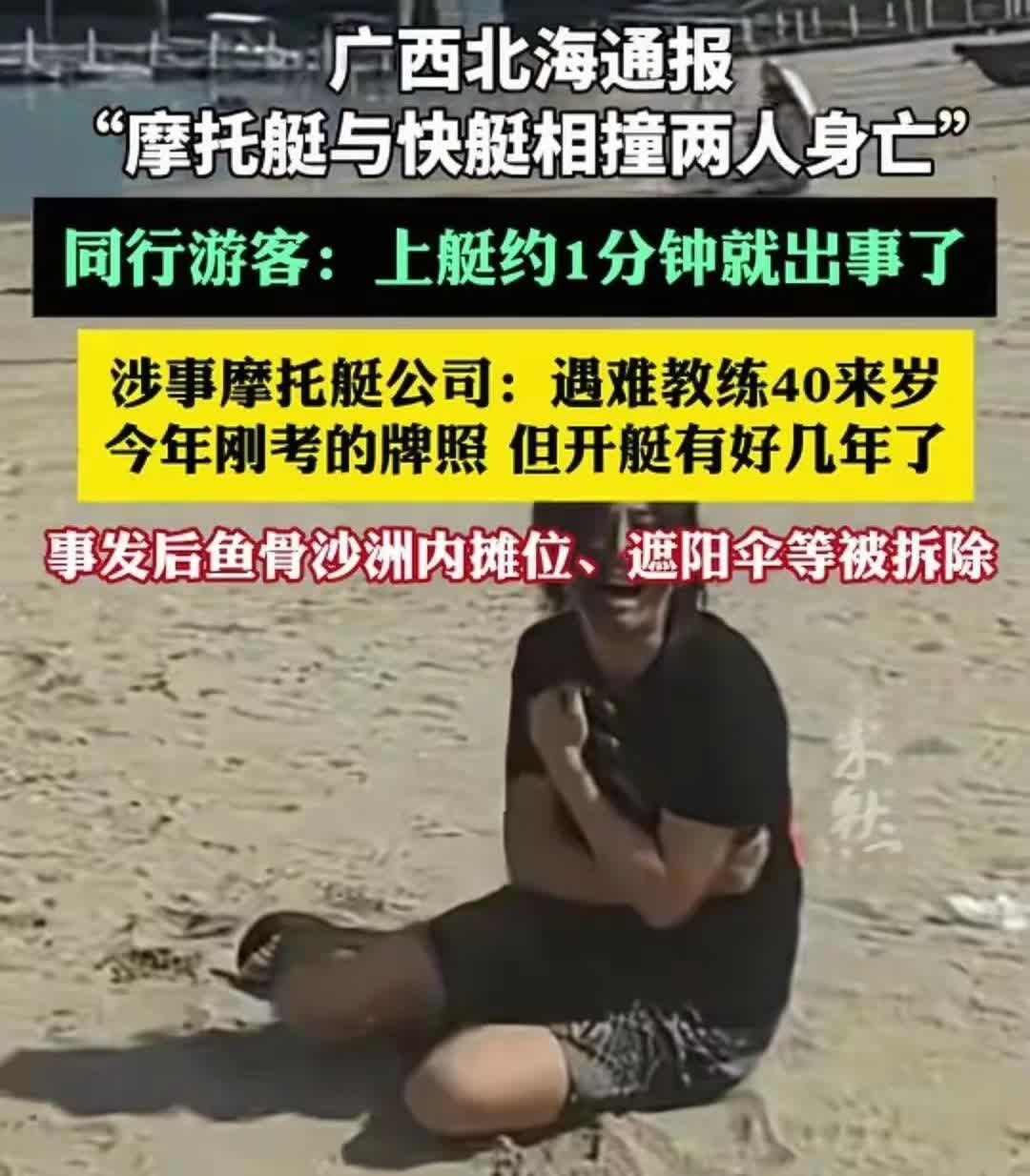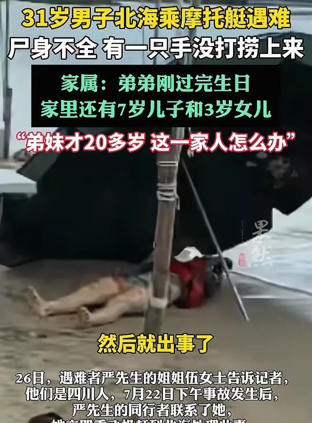 可怜啊!22日中午广西北海一31岁的男子严某驾驶着摩托艇,后座是40多岁的摩托艇