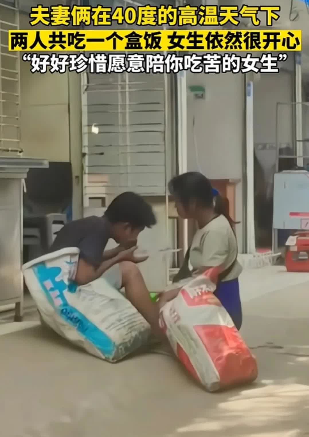 女孩陪男子40度高温吃一个盒饭 希望这个男的不要辜负这个满眼是你的女孩,她本可以不陪你在这吃这份苦,但是为了你,宁愿坐在地上和你共吃一份盒饭。 现在这种女孩是少了,大多谈恋爱前如果知道条件不好根本就不会和你开始,更别说坐地上吃盒饭了!