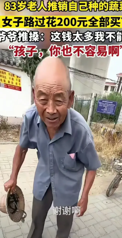 江苏,83岁老人卖自己种的蔬菜,女子塞给他100元,老人没零钱,对女子说:“算了,不要钱了,你把菜全拿走吧。”女子把菜提上,又塞给老人100元。老人吓得直摆手:“我不能要这钱,孩子,你们也不容易。”