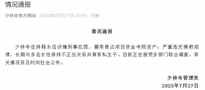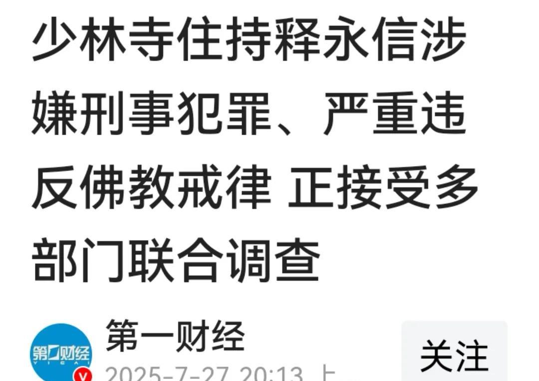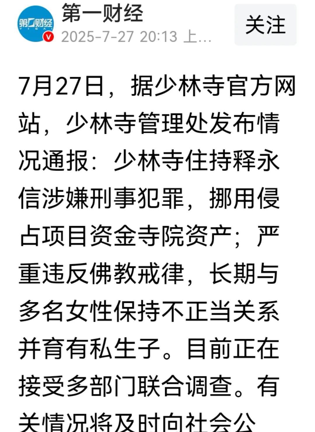 花和尚释永信实锤了,他若干净,那才是怪事! 千古奇闻,和尚当成了土豪,老板,还有多个情妇! 7月27日,据少林寺官方网站,少林寺管理处发布情况通报:涉嫌刑事犯罪,挪用侵占资产;违反佛教戒律,多名情妇,育有私生子。 正在接受多部门联合调查,这个联合说明问题的复杂性和严重性! 想起一句俗话,洋芋在不同的土壤种出的不一定是洋芋,把一个和尚泡在钱堆里,和尚肯定变质,传闻很多,这次会一个个检验了! 金钱面前,信仰就是笑哈哈!#释永信风波背后 袈裟与西装的撕裂# #释永信被查# #少林和尚#