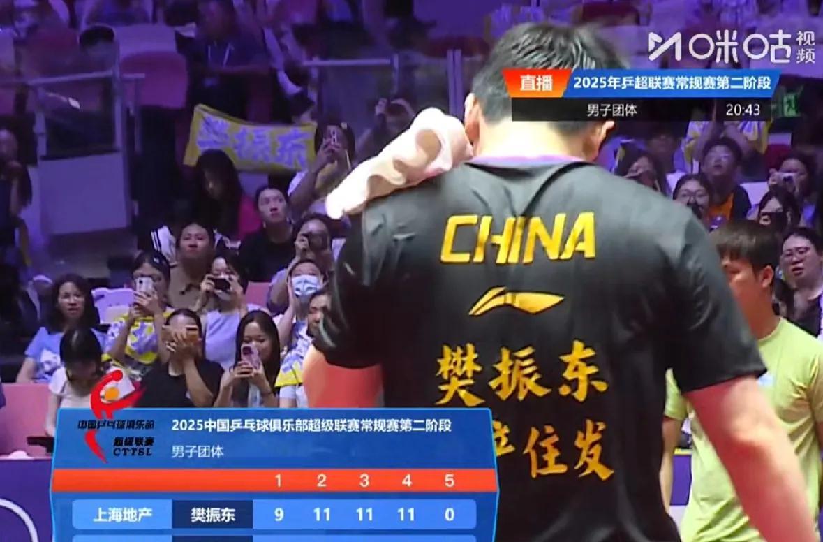樊振东乒超三天都在打比赛, 而且每天比赛都是主力, 其他俱乐部都有休赛, 还有一天只打一场, 就发现上海地产每场必上, 许昕现在只是选择性的打一盘, 多亏现在赵子豪冲上来了, 可以为樊振东扛一分, 这样打下来樊振东消耗太大, 今晚又是打满二盘, 每场比赛都是大汗淋漓的。 场下的粉丝也很敬业, 每场都在大声喊加油, 甚至都顾不上吃饭, 应该也是双向奔赴吧, 樊振东很珍惜前两个阶段的比赛, 毕竟后两个阶段不能参加了, 所以多打比赛多攒积分, 这样的樊振东魅力无限。 图片来自网络侵权可删。