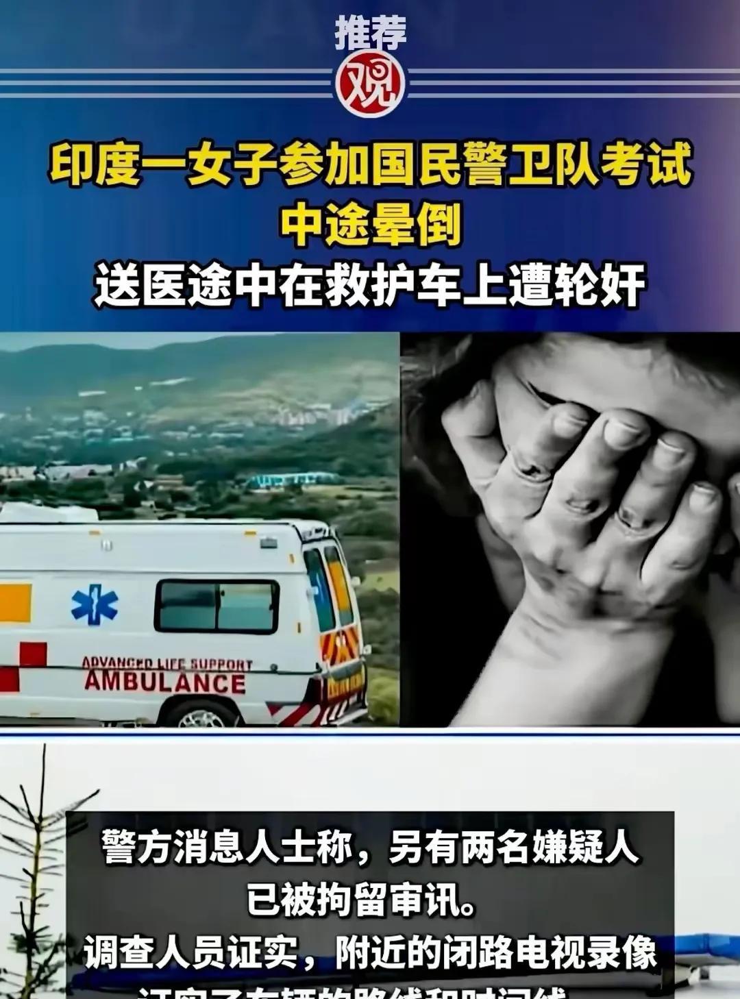 印度再爆出炸裂新闻,19岁女子在救护车上被多人强奸! 印度媒体7月26日披露了发生一起发生在该国的一起强奸案:在印度比哈尔邦近日举行的体能招募测试中,“一名19岁的比哈尔邦女子因潮湿和高温而晕倒,然而据报道称在被送往医院的救护车上遭到多人强奸”。 女子在医院恢复意识后,感觉到腹部和私处剧烈疼痛,遂报警求助。 轻度,中度,重度,印度。这句话的含金量真是越来越高了! 印度要是申奥成功了,甚至连五环都得是实心的! 印度男性,无孔不入!!!
