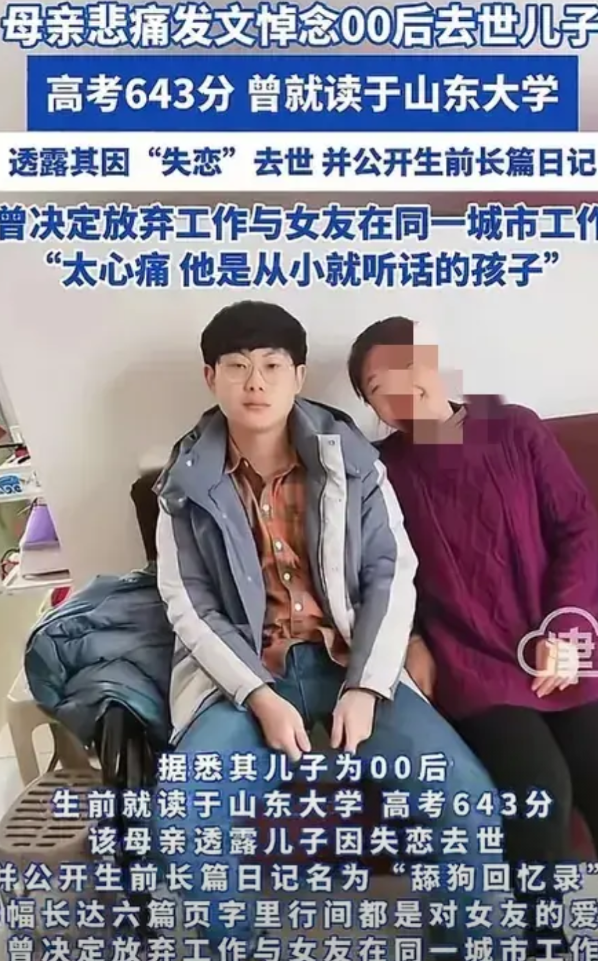 近日,00后男子失恋后去世,母亲发文悼念“你抛下最爱你的亲人、朋友、同学,太多的遗憾,太多的思念,来日无方长,一别无归期。” 男子毕业于山东大学,高考643分,是母亲的骄傲。 母亲说,男子已经决定辞掉工作,打算去女朋友所在的城市生活,没想到这时女朋友却提出分手。 男子陷入悲痛之中无法自拔,在失恋的日子里写下长篇日记《舔狗回忆录》,记录了与女朋友所有的美好回忆。