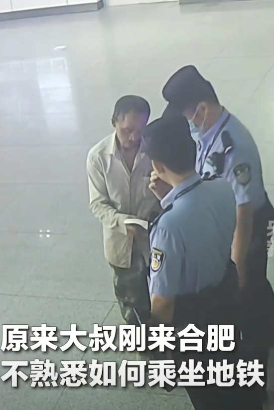 “这两个警察火了”!有一位大叔用扁担挑着两麻袋的行李,他站在合肥地铁一号线,眼神惶恐又不安,一只手上还提着老旧的电风扇。