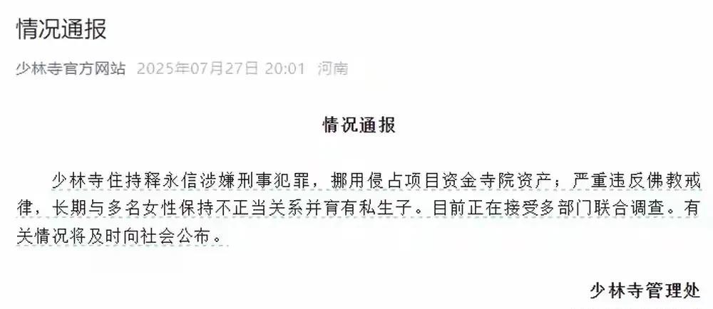 而今,官方媒体终于出手,果断地挑开了这层长久以来笼罩在迷雾中的神秘面纱。据披露,少林寺方丈释永信涉嫌侵占寺庙资产、公然玷污佛门清规,甚至与多名女性关系纠葛不清,还诞下了私生子。 十数年来,那些关于他筑奢华华宅、驾名贵豪车、拥娇美佳人的传闻,就像街头巷尾不断回响的嘈杂喧嚣,从未停歇。民间不少人听信了这些传言,竟赠予他“天下第一淫僧”的谥号,将其视作亵渎佛门的“孽障之徒”,言语间满是愤慨与唾弃。 如今东窗事发,许多人皆感慨这是迟来的正义。毕竟,佛门向来最重因果轮回,讲究善恶有报。这位搂着红颜、口中却念着弥陀的所谓“高僧”,在众人眼中,终究是逃不过天道轮回那无形的审判。正所谓:“不是不报,时辰未到;时辰一到,善恶皆报。”#分享城市新鲜事#