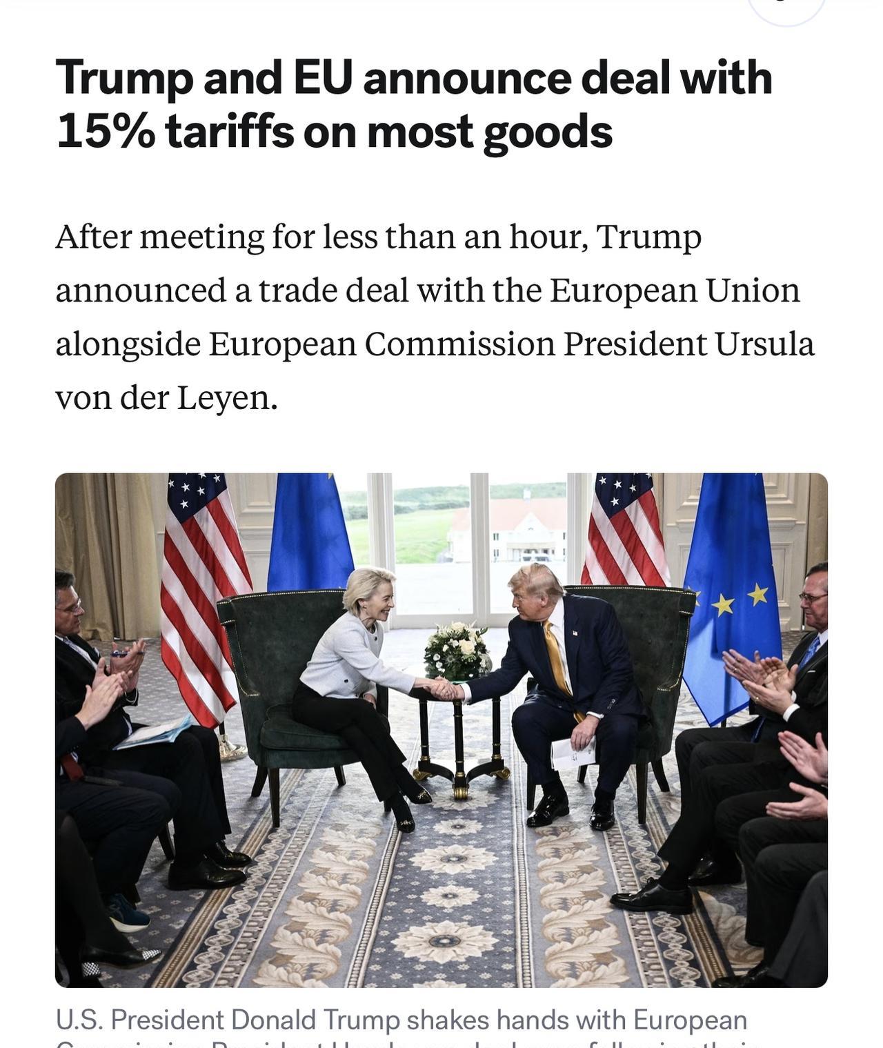 在与欧盟委员会主席乌尔苏拉·冯德莱恩会面不到一小时后,特朗普宣布与欧盟达成贸易协
