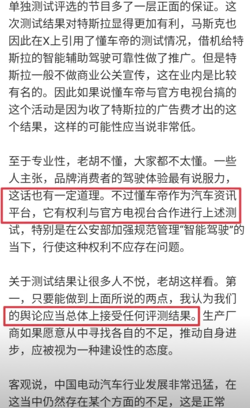 近日,胡锡进发文力挺懂车帝,老胡表示“这个节目是懂车帝与官方电视台联合制作的,它的公平公正性高于一般商业平台”,老胡声称“懂车帝作为汽车资讯平台,有权利与官方电视台合作进行上述测试”。 不得不说,胡锡进口口声声说道“与官方电视台联合制作”、“与官方电视台合作”,显然一再突出懂车帝争议测试项目的官方背景。可是不管央视还是懂车帝,都没有工信部认证的车评资质,有什么理由说它们的测试项目是权威的呢? 须知任何专业测评都需具备相关资质或证书才能开展,也就是俗称的“持证上岗”。如今懂车帝没有汽车测评资质或者证书,其测试项目充其量只是第三方业余的,既不能算作官方,也不具备任何权威性。为何胡锡进一口咬定懂车帝的测评就是“公平公正”的呢? 虽然胡锡进一贯为美国的高科技叫好,这次懂车帝的评测项目把特斯拉排到了第一名,但是这不能构成老胡力挺懂车帝的理由,因为否则不是授人以柄吗? 那么胡锡进如此力挺懂车帝,又是出于什么原因呢?