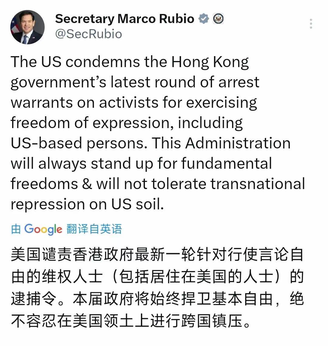 美国国务卿鲁比奥昨晚(北京时间7月26日晚)公然发文称:"美国谴责香港特区政府最