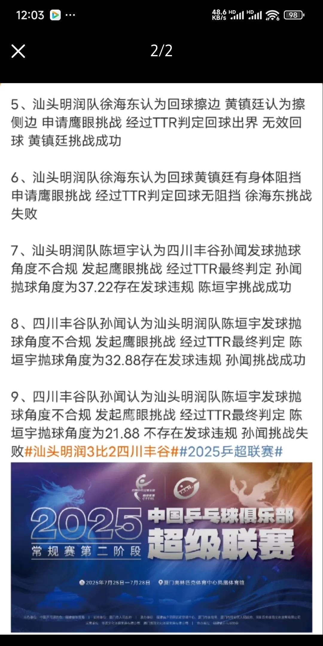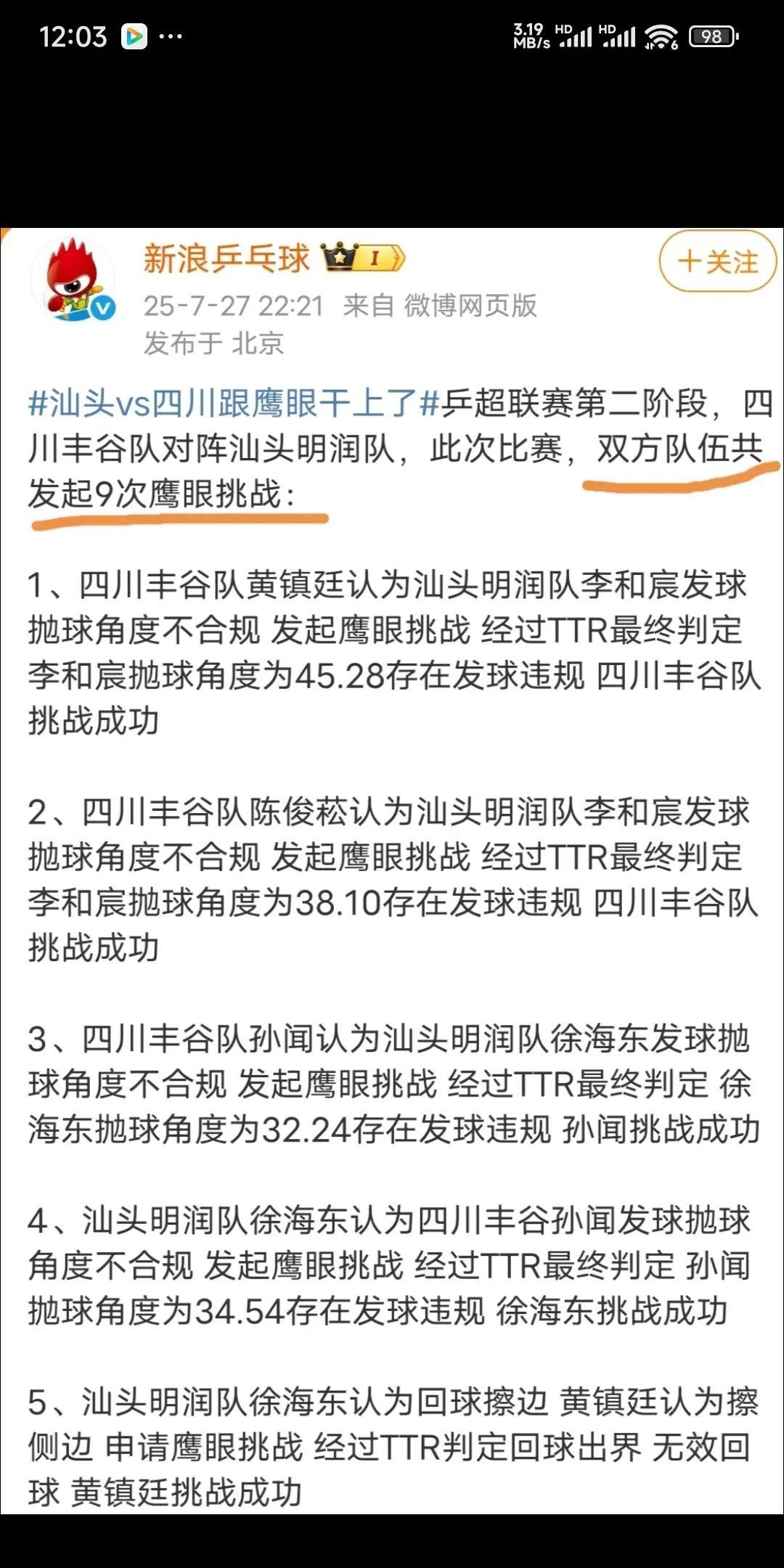[捂脸][捂脸]四川丰谷VS汕头明润,一场球发起9次鹰眼挑战,好不容易在一号台,可算是把平均值拉满了! 45.28度那个也确实离谱到家了!!合规是不超30度呐! 不知道会否是本赛季裁判最忙的一场比赛咖![捂脸][捂脸] 有一种花钱买鹰眼设备了,那就势必用回本的气势![捂脸][捂脸] 除了大圣,其他五个人都半斤八两,大圣挑战的全成功了!国际赛场上的奥运选手就是不一样!正规军经验和球品都好! 摇摇晃晃中,明润最后赢下了比赛![呲牙][呲牙]