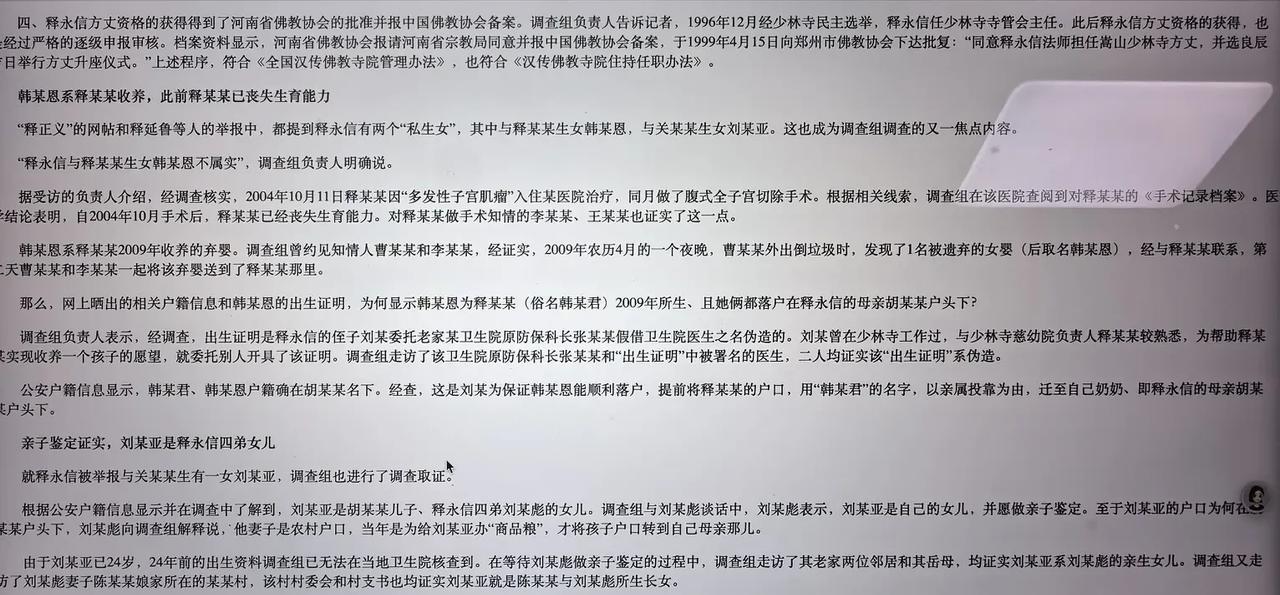 揭秘!释永信案发后六大问题浮出水面 释永信10年前被举报有两个私生女,分别为与韩某某生的韩某恩和与释某某生的刘某亚(释永信俗名刘应成)。 2015年7月25日,有一位自称少林寺弟子的“释正义”发网帖曝光了少林寺住持释永信的一系列问题,随后在8月8日,释永信的弟子释延鲁对释永信进行了实名举报。两人的爆光和举报中有提到释永信有两个私生女。除此之外,举报称释永信“被迁单”(即僧人犯戒被摈出门),没有合法资格当选主持,并公布了1988年4月23日当时名誉方丈释德禅对释永信的《迁单文书》。 而河南省调查组调查结果是:释永信当年“被迁单”的说法不属实,是个别人的自私行为,是无效的,此后方丈资格的获得如法合规。并澄清私生女传闻说,韩某恩系释某某收养,此前释某某已丧失生育能力。同时称亲子鉴定证明,刘某亚时候是释永信四弟女儿。 现在少林寺公告已经证明释永信与多女有染,并有私生女。那么想追问一下河南省的相关部门和当年的调查组: 1、释永信的被迁单、非法获取方丈资格是否属实?谁协助他完成了这一几乎不可能完成的任务? 2、释永信的一系列高速升迁过程中,有没有其他的人给予了不正当帮助?有没有其他行贿受贿等违规情况? 3、释正义和释延鲁当年举报之后,生活发生了什么变化,有没有受到打击报复,他们现在怎么样? 4、韩某恩、刘某亚是否就是释永信的私生女?为什么调查组给出那样的结论? 5、当年是什么人去调查过此事,什么人给出的亲子鉴定,什么人让什么医院给出具的韩某不能生育证明? 6、释永信的四弟是否也参与做伪证?其他还有哪些人做过伪证? 佛门净地岂能用来藏污纳垢?希望释永信涉嫌刑事犯罪这件事情像铅中毒事件一样,最终会出具一份360度无死角的调查结果,并对所有涉事人员以公开公正公平处理和交代。