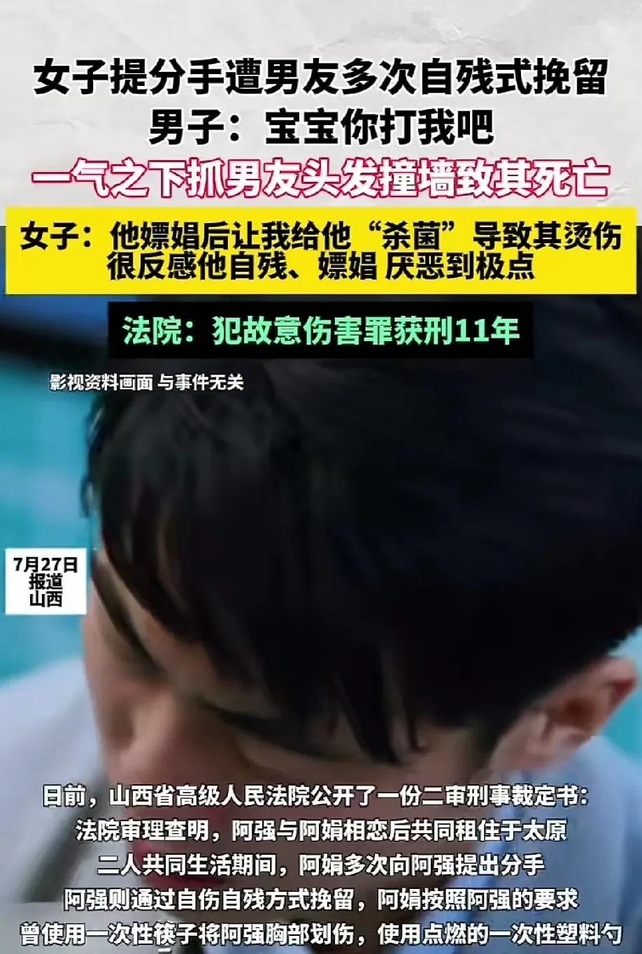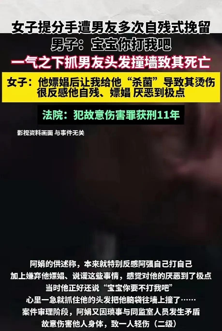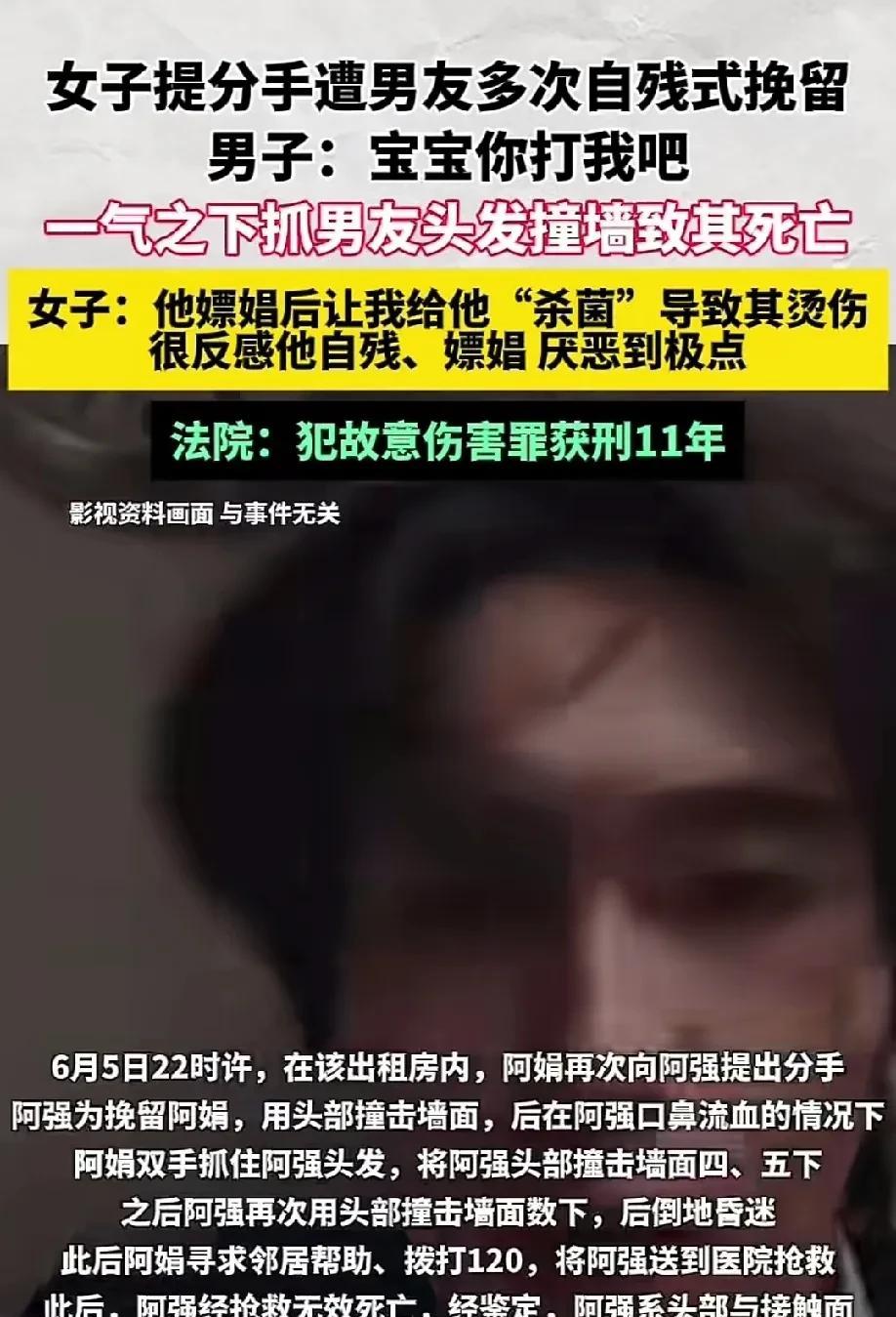 来源:【江西旅游广播】 而此次,他选择直接用头部撞击墙面,后在阿强口鼻流血的情况下,阿娟双手抓住阿强头发,将阿强头部撞击墙面四、五下之后,阿强再次用头部撞击墙面数下,后倒地昏迷! 此后阿娟寻求邻居帮助、拨打120,将阿强送到医院抢救,最后,阿强经抢救无效死亡! 经鉴定,阿强系头部与接触面较大且平整的钝性物体多次作用致严重颅脑损伤死亡! 阿娟的供述称,本来就特别反感阿强自己打自己,加上嫌弃他嫖娼、说谎这些事情,感觉对他的厌恶到了极点。当时他正好还说“宝宝你要不打我吧”,心里一急就抓住他的头发把他脑袋往墙上撞了.... 看到此事,真的不免有些唏嘘,就因为谈了一次恋爱,让两人都陷入了“地狱”——男方失去了生命,女方进了监狱,这不仅仅是把自己的一生都毁了,更是将两个家庭都毁了! 这也提醒我们,在日常生活中,遇到任何事情,都要学会三思而后行,不要因为一时的冲动就做出无法挽回的事情! 我们要学会做情绪的主人,而不是变成被情绪掌控的傀儡!