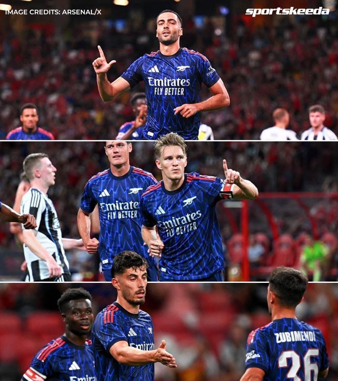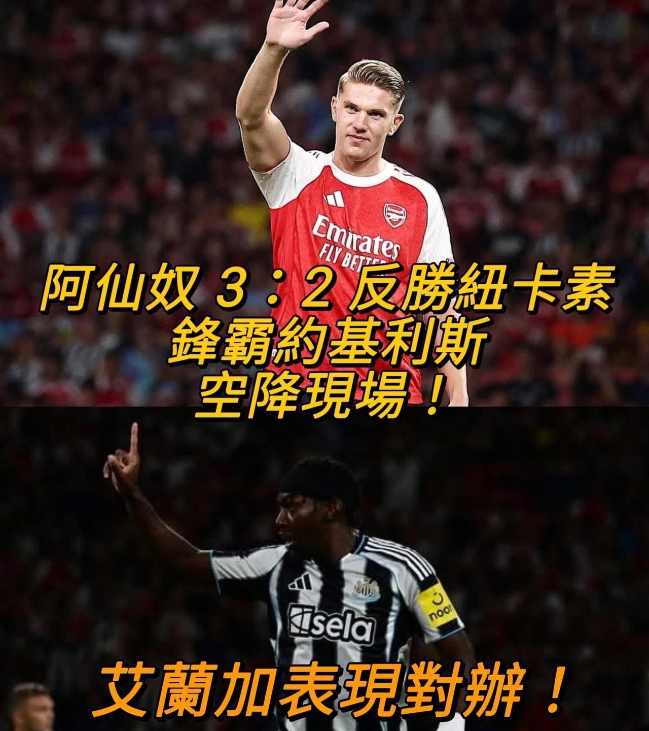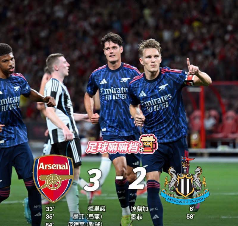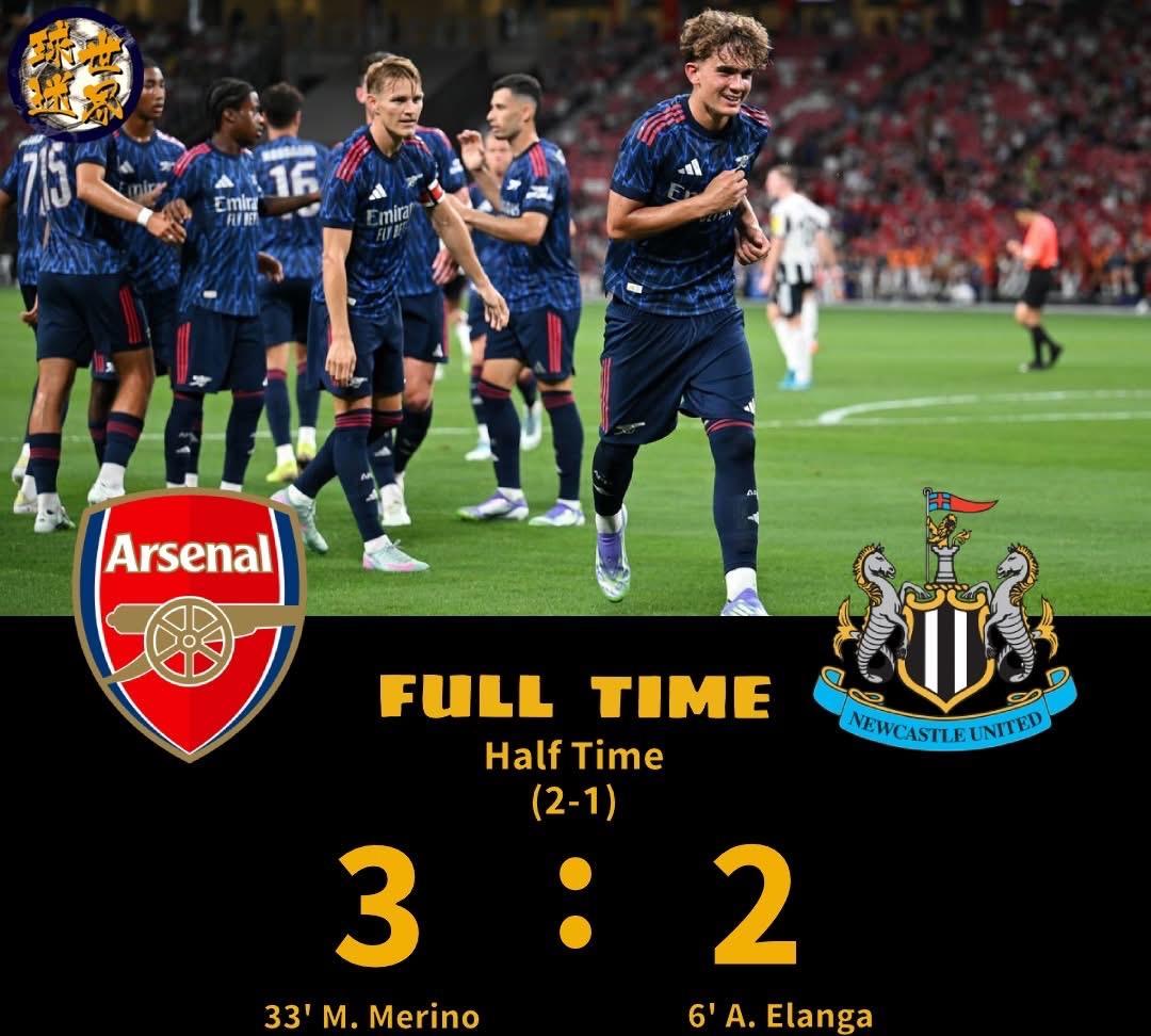 33’ 米克尔·梅里诺 35’ 亚历克斯·墨菲(OG) 84’ 马丁·厄德高 那些没见过年轻C罗和年轻梅西踢球的朋友,现在弥补遗憾的时刻到了,你们千万一定要见证15岁的道曼啊!(马克斯·道曼) 才15岁(道曼直到12月才满16岁)天赋真的肉眼可见,传球时机、盘带能力、人球结合,此子未来必成大器!希望新赛季能够跻身一线队,获得稳定出场时间吧! 回到比赛,近几年来 纽卡一直是阿森纳的苦主,上赛季联赛杯半决赛,枪手两回合惨遭喜鹊双杀,被压制得毫无脾气。 因此,虽然是友谊赛,但阿森纳显然非常重视。 最终,阿森纳3比2力克纽卡,成功打破了心魔! 纽卡开场仅仅五分钟就打穿阿森纳的后防线,埃兰加中路推射破门,纽卡取得梦幻开局! 此役,纽卡多次在右路做文章,阿森纳的左边路频频被打穿,这是新赛季需要注意的地方。 第33分钟和第35分钟,阿森纳连进两球完成逆转,梅里诺的劲射扳平比分,墨菲的解围不慎自摆乌龙。 下半场,同名但不同人,另一位墨菲破门帮助纽卡把比分扳成2比2,最后时刻枪手获得点球机会,厄德高操到命中完成绝杀! 美中不足的是,虽然标王哲凯赖什入选了大名单,但由于时差关系,最终未能在本场比赛迎来首秀。