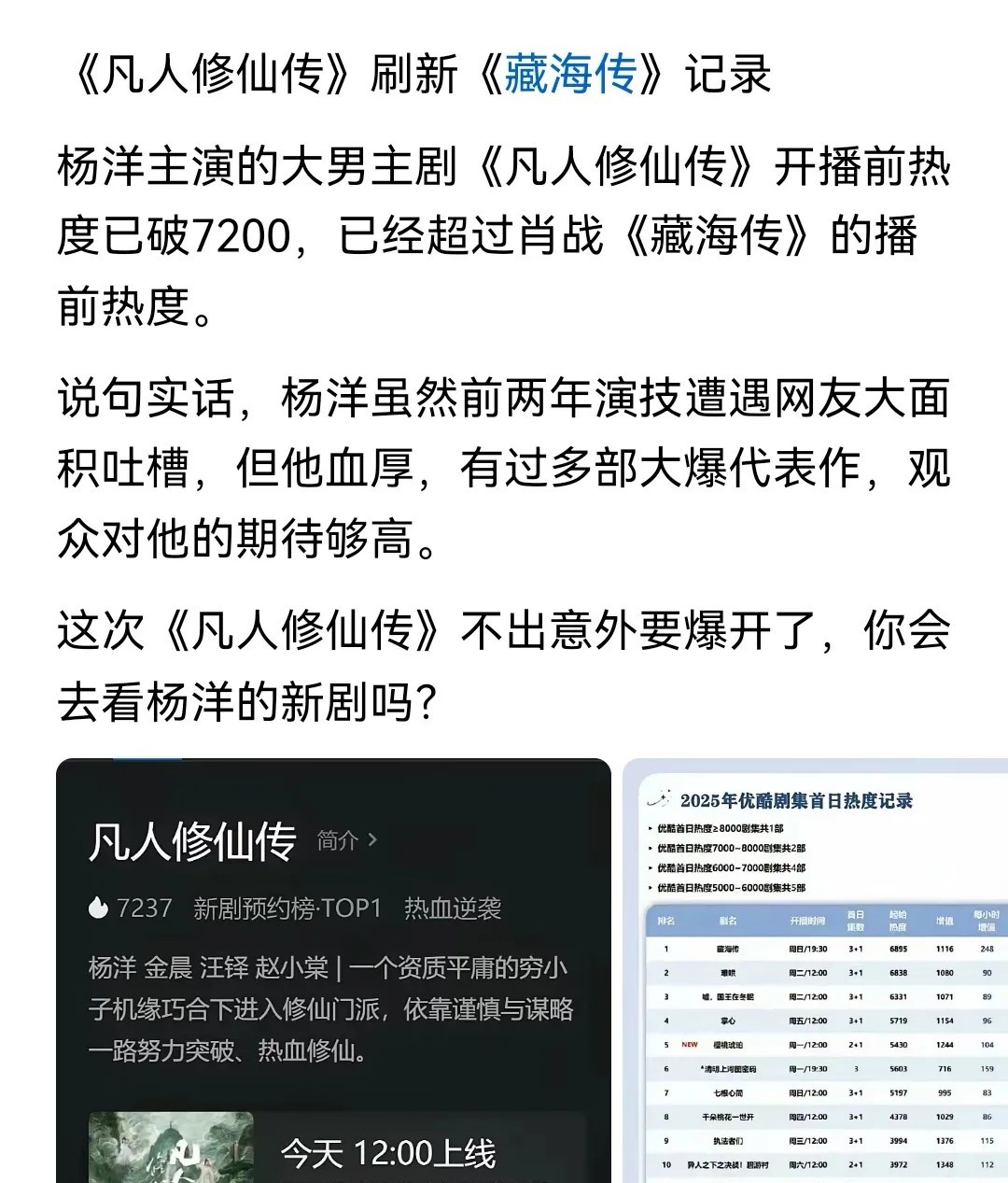 所以,杨洋《凡人修仙传》的热度会超过肖战的《藏海传》? 近日,有眼尖的网友