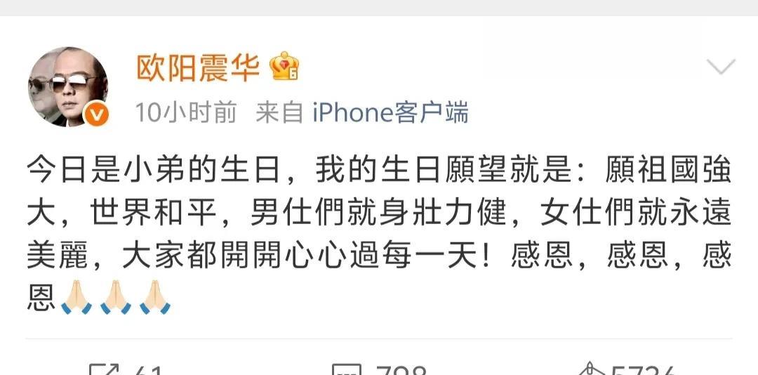 连生日愿望都想着希望祖国强大,香港明星欧阳震华的拳拳爱国心确实令人感动。 一般不
