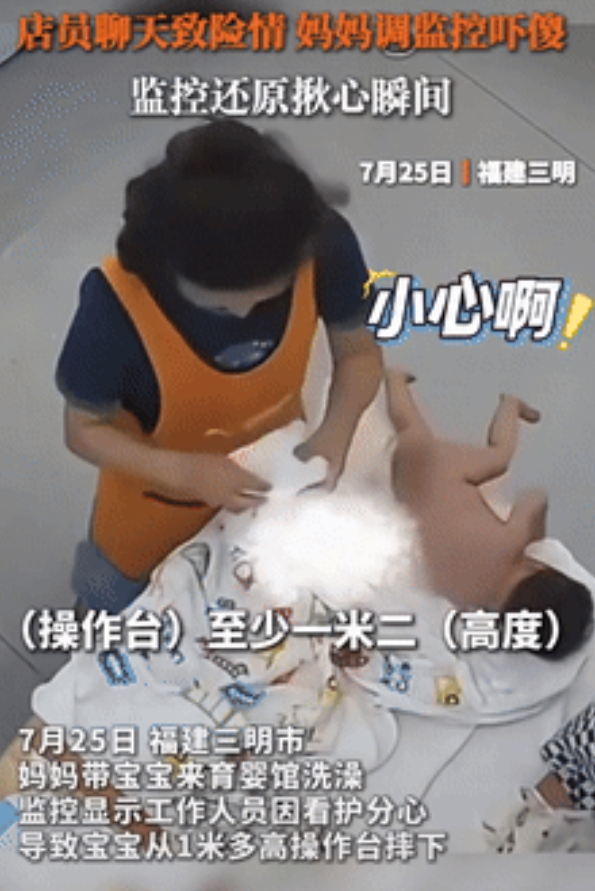 “心不是一般的大!”福建,一女子带3个月宝宝去洗澡,不料离开结账时,突然听到宝宝大哭,女子坚持要查看监控,这才发现店员忙着聊天,结果孩子从1米多高的台子上掉了下来,更让人心寒,对方只是说了一句“不好意思”。