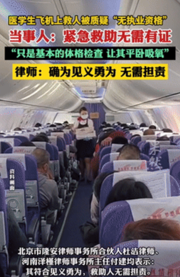 该不该救?一医生学坐飞机时,遇到有乘客突发疾病,便及时去施救,不料,当事情被传开后,竟然有人质疑他“无执业资格”,无奈之下,当事人只好回应:紧急救助无需有证! 据齐鲁晚报7月27日的报道,事情是这样的,在一架从武汉飞往新疆的航班上,有位女乘客突发疾病,手指不受控制地发抖,呼吸变得又急又浅。 机组那边得知情况后,就通过广播寻求帮助,看看有没有医生在,好巧不巧,飞机上刚好有个医学生。 虽然小伙今年才读大二,但有半年的急诊见习的经历,见过不少紧急情况,所以就站出来去救人。 当他来到那位乘客的身边后,先摸了对方的脉搏,经过询问,了解到她的以前的病史后,便开始对其进行救助。 不过,虽说该乘客的情况,看起来挺危急的,但实际上处理起来,也没那么麻烦,在给她测量了血压、血氧饱和度后,小伙就让她吸了会氧气,再让她平卧着。 没过多久,乘客的脸上渐渐有了血色,能自己坐起来了,落地前,小伙就交代她,可以再去医院检查下。 事后,校方得知此事后,还专门发文表扬这件事,没想到引来不少闲话,竟然有人说他没行医资格也敢动手,万一把人治坏了怎么办。 其实这位小伙心里很清楚,他做的不过是让病人躺平吸氧,这种最基础的处置,既没打针也没用药。 法律上这叫紧急救助,只要操作得当就不用担责,该乘客后来专门打电话道谢,说要给他送面锦旗。 这事儿让人想起老一辈常说的“救命如救火”,飞机上那种前不着村后不着店的地方,突然有人不行了,是等着看证件齐全的医生从天而降,还是让懂点医术的先搭把手? 小伙说自己在急诊科学了半年,肯定知道什么该做什么不该碰,这种有分寸的帮忙值得夸,总比围着拍视频的强。 现在有些人的想法挺奇怪,看见好人好事先琢磨里头有没有猫腻,要都这么想,往后谁还敢伸手帮人? 信息来源:齐鲁晚报·果然视频 《医学生飞机上救人被质疑“无执业资格”,当事人:紧急救助无需有证,已在急诊见习半年,律师:确为见义勇为》2025-7-27