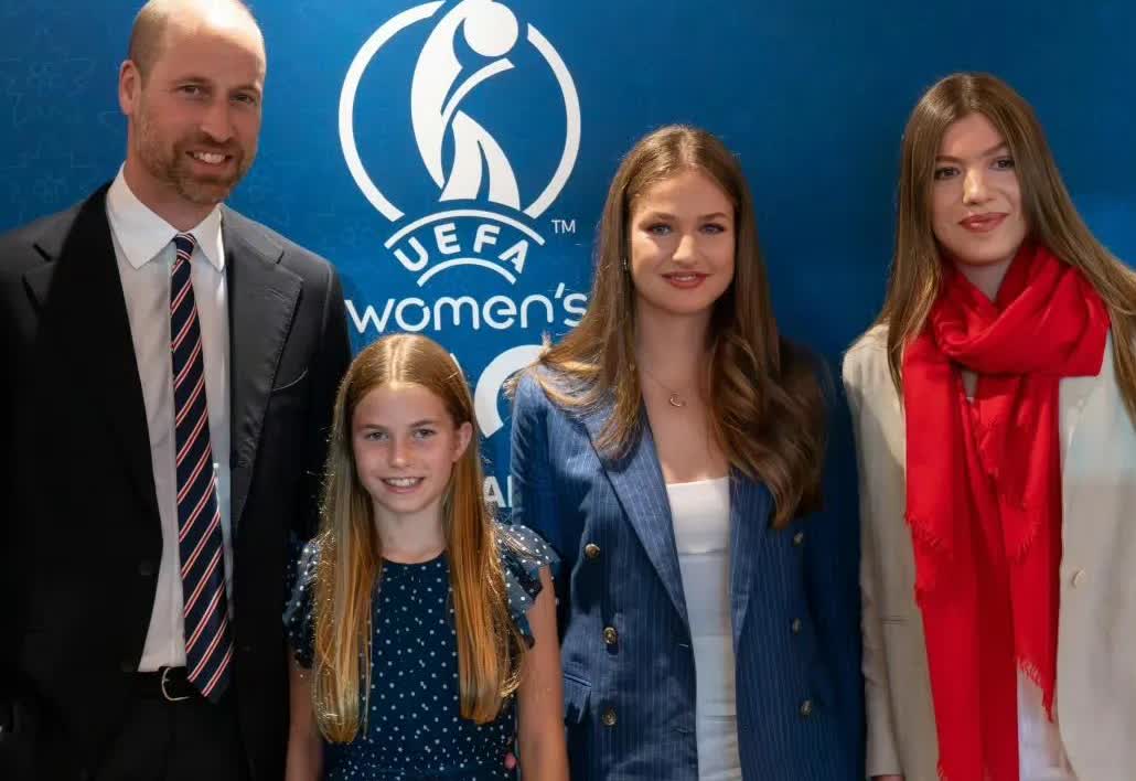 三位人气最高的欧洲王室公主同框了!这还是夏洛特公主和西班牙两位公主首次见面。 女足欧洲杯决赛西班牙对英格兰,威廉带着夏洛特,莱昂诺尔和索菲亚一起到场看比赛,四个人惊喜同框。比赛结束后,四个人合影留念。 三位公主同框挺让人开心的,两位西班牙公主真的好漂亮,她们跟夏洛特公主打招呼时超级温柔,一起看向威廉王子的眼神也很有趣,四个人互动挺养眼的。 西班牙和英国王室经常同框,这次同框组合是首次见到,也是最让人惊喜的一次。