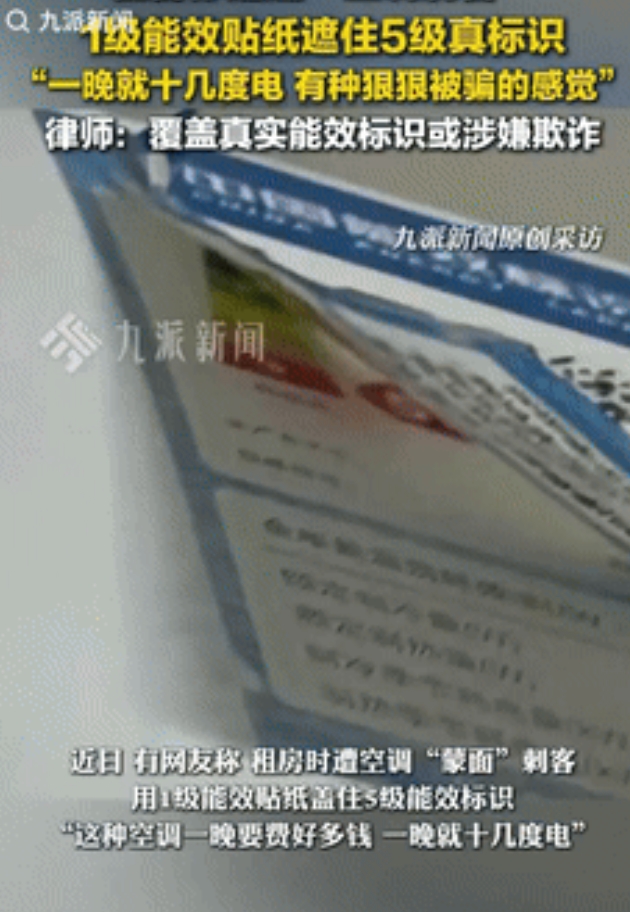 “缺大德了!”一女子开空调时,发现能效标识翘角了,透过纸能看到里面有红色的标识,女子心生疑惑,就尝试把外层纸撕下来,没想到,房东竟用1级能耗的贴纸,遮住5级的真标识,女子感觉自己被骗了,网友:租房房租不是目的,水电费才是最大的利润! 7月23日报道,女子小溪回家第一件事就是开空调,外面温度太高了,不开空调屋里很闷热,就算坐在沙发上一动不动都感到热,可让小溪没想到的是,空调上的能效标识竟翘角了。 这个房子是她租的,里面所有的家具,家电都是房东提供的。小溪想着这个空调肯定用时间久了,不知道房东有没有找人把空调清理过,她一边想着一边将空调的标识撕下来。 结果她竟发现里面还贴有能效标识,而上面写的竟是5级真标识!也就是说,空调上贴了两个能效标识,最外面贴的是假的,上面写着这个空调非常省电,是1级能效,结果里面贴的才是真的,这个空调实际就是5级能效! 小溪看到这一幕后,觉得自己被骗了,原来以前交的那么多电费,大多数都花在空调上了!她特别不理解,如果空调费电,租户不想用的话可以买风扇,空调不开就是了,没必要遮盖啊。遮盖住的话,大家都以为这空调是省电的,都被欺骗了! 碰到这种事情,小溪觉得很离谱,赶紧把家里的家电只要带标的都看看,想知道除了空调,还有什么也是费电的。 除此之外,她还把这件事发布到网上,让网友们都看看,尤其是那些和她一样在外面租房子住的,一定要看看,千万不要被蒙在鼓里。 有网友看后表示,自己原来租房空调也是5级,带着几个月女儿,一天24小时开着,家里也不做饭,一个月电费800—1000! 还有人说,曾租的空调坏了,叫房东换一个,直接给整个五级能效,房东还说自己也用! 其实,空调不管是几级能效,房东都应该直接告诉租客,让他们自己选择,而不是瞒着租客,这样是不对的。 那么,你们有没有碰到过这种离谱的事情?