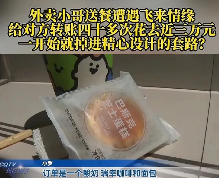 重庆,22岁外卖小哥送餐过程中,一女子将餐送给小哥吃,小哥深受感动,并加了对方微信。女子自称大学生,家里困难,问小哥借钱,小哥心生怜悯,借钱给她。后来,女子要小哥做她男朋友,两人开始线下见面,见了五六次,但小哥连对方手都没牵过。女子问小哥要钱的次数越来越多,累计要走30000元后,删除小哥,要求分手。小哥这才意识到,自己从一开始就落入了甜蜜陷阱。