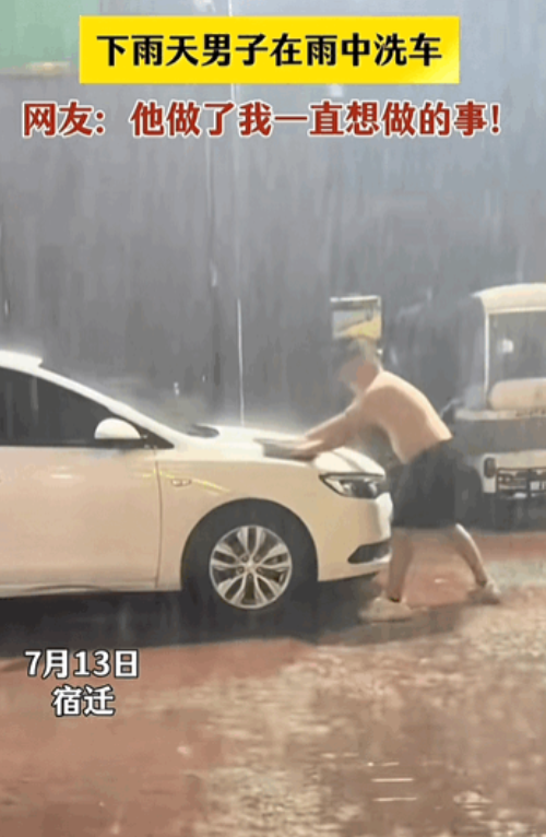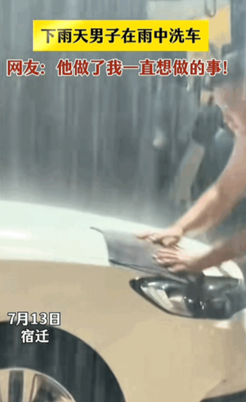 老天爷的便宜都占!宿迁,下雨天,男子突发奇想脱光膀子在大雨中洗车。男子手拿抹布穿着大裤衩,在雨中不停地抹车。你别说这个办法还真挺好,既省钱又省水,就是有点费力。网友:他做了我一直想做的事情!