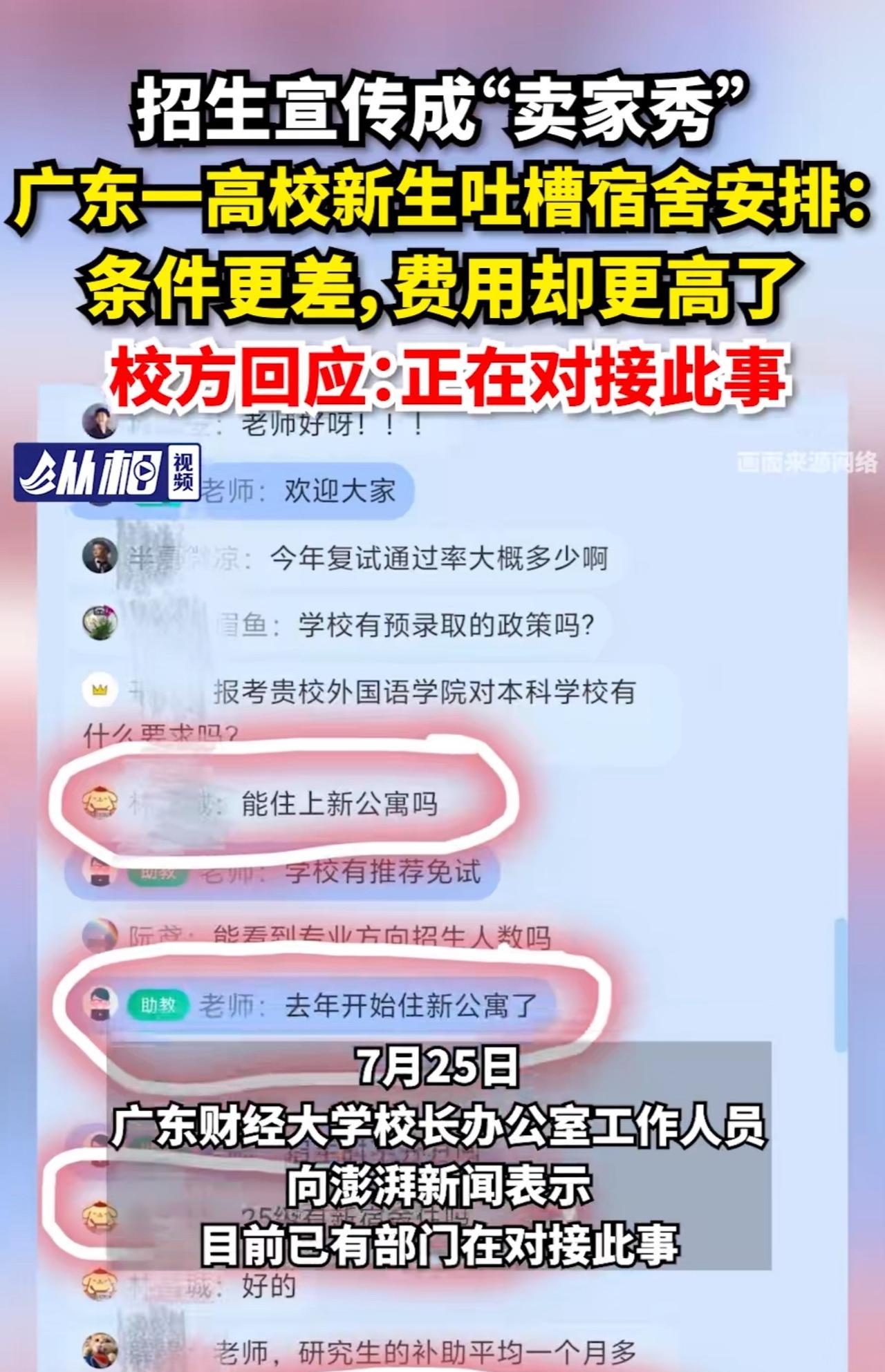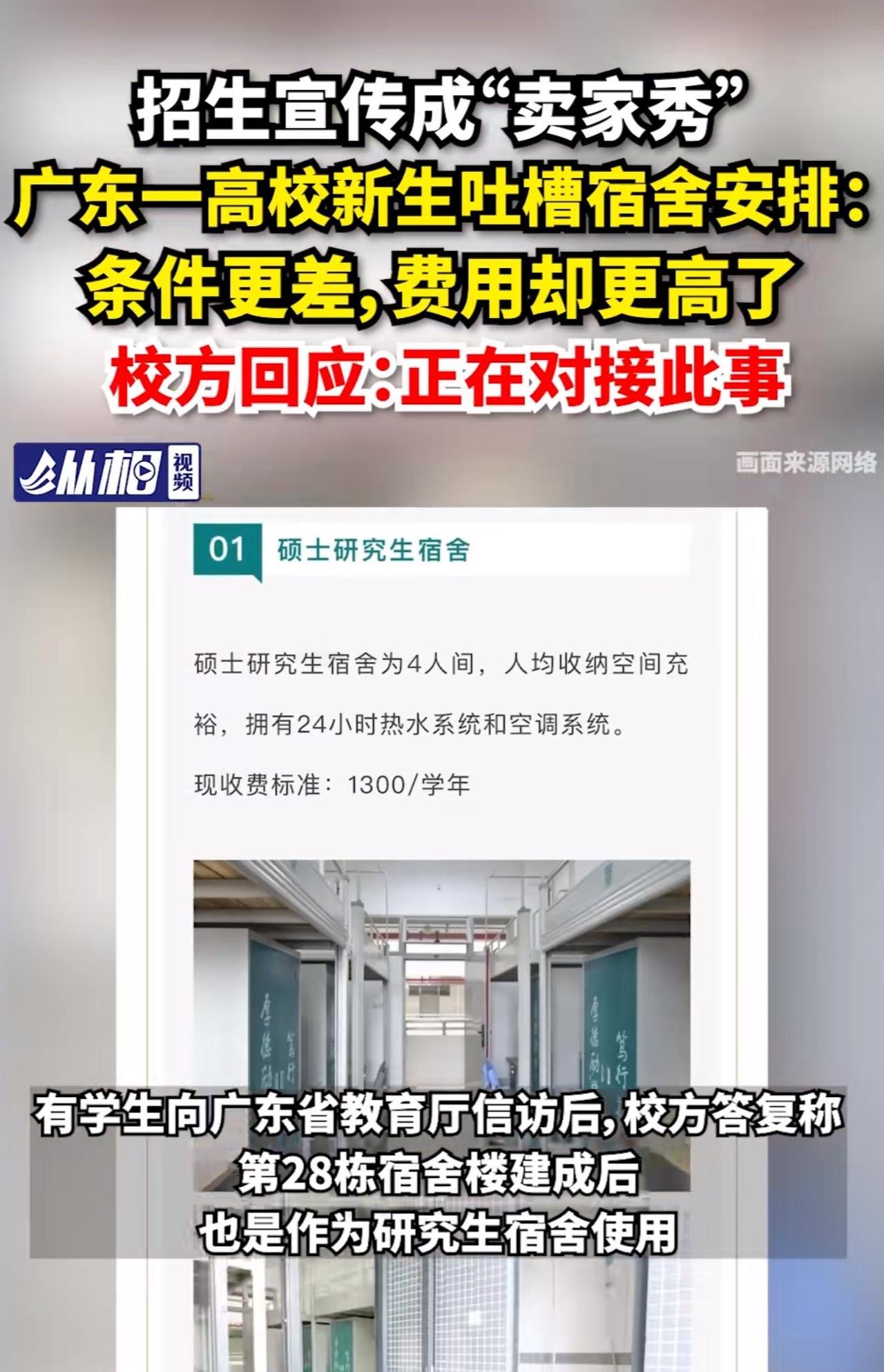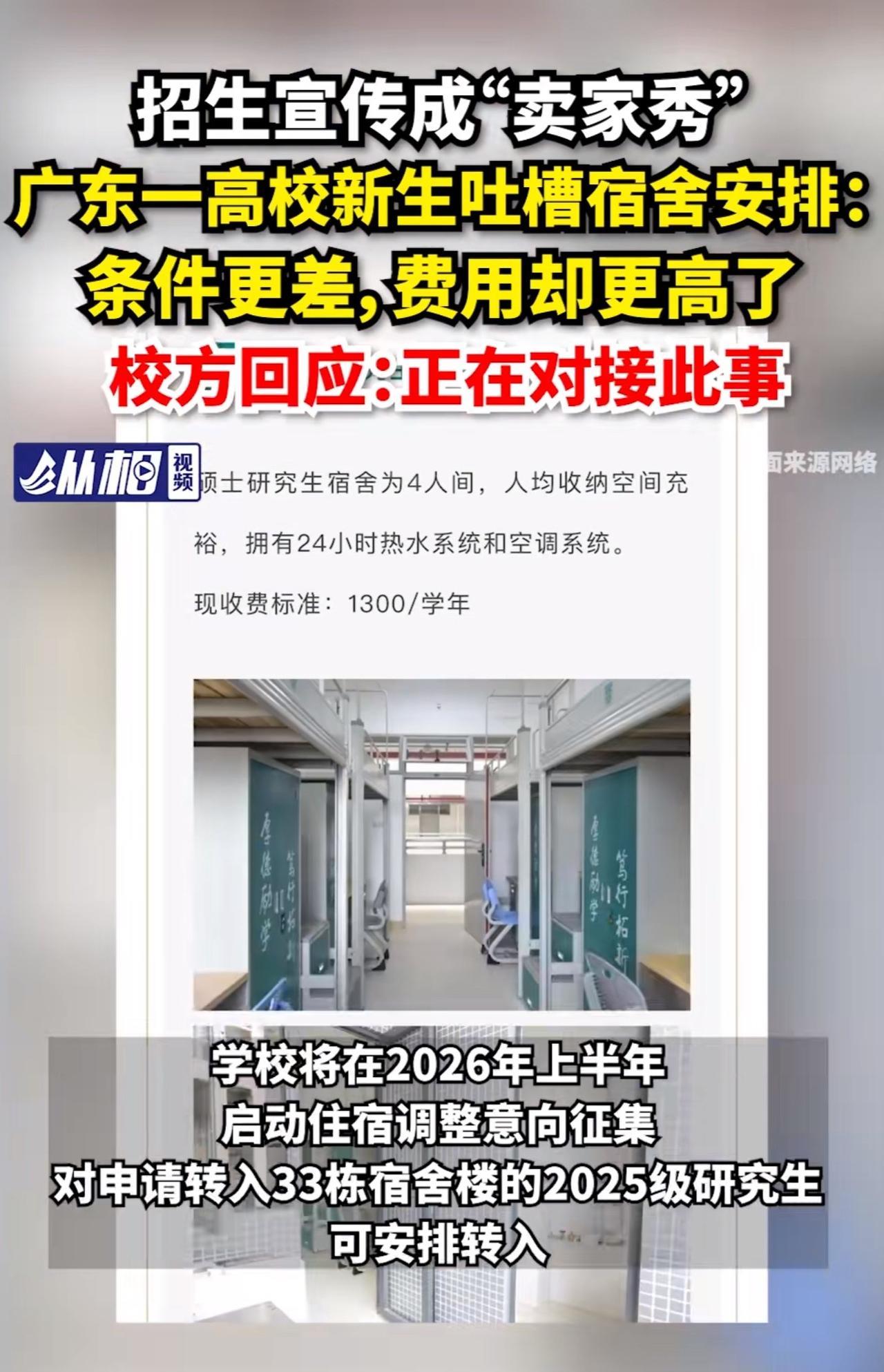 #MCN双量进阶计划#“这就尴尬了!”近日,广东财经大学多名即将入学的硕士新生爆料,说接到学校通知入住的宿舍条件和此前校方招生宣传的研究生宿舍不一样,条件更差、费用更高,甚至还有部分房间被改造成了对外经营的公寓。 针对此情况,网友们意见不一。有网友说,“ 现在的大学到底给学生教会了什么,我以前也是住旧的研究生宿舍啊,也没啥吧!” 还有网友则认为,“招生宣传成“卖家秀”,这多少有些不妥,至少要讲究诚信!” 对于众多硕士新生的质疑,该学校回应,称“第28栋宿舍楼建成后也是作为研究生宿舍使用。学校将在2026年上半年启动住宿调整意向征集,对申请转入33栋宿舍楼的2025级研究生,可安排转入。目前,已有部门在对接此事。!” 这事看下来,周少总觉得学校有点“先上车后补票”的意思。招生时把好宿舍当卖点,新生来了却换条件,费用还更高,换谁心里都得打个疙瘩,心里都得不舒服很不爽。 有人说“住旧宿舍也没啥”,这话不全对。学生不是不能住旧楼,怕的是“货不对板”,宣传时画的饼,开学变成了另一回事,这其实是对学生选择权的不尊重。毕竟考研选学校,住宿条件也是不少人考虑的因素。 学校说2026年能调宿舍,听起来给了个盼头,但新生还要先将就一年。而且“意向征集”能不能顺利落地,会不会有额外条件,这些都是学生关心的。 再者说,费用没降、条件缩水,总不能用“以后会好的”来当挡箭牌吧。其实这事的关键不在于宿舍新旧,而在于诚信。这事处理起来也不难办,要么按宣传标准赶紧整改,要么明说实际情况让学生提前有心理准备。 对于该校硕士新生称宿舍条件差费用反而高,大家怎么看呢?如果是你,你会怎么解决?#长沙新朋友# #寻美三湘#