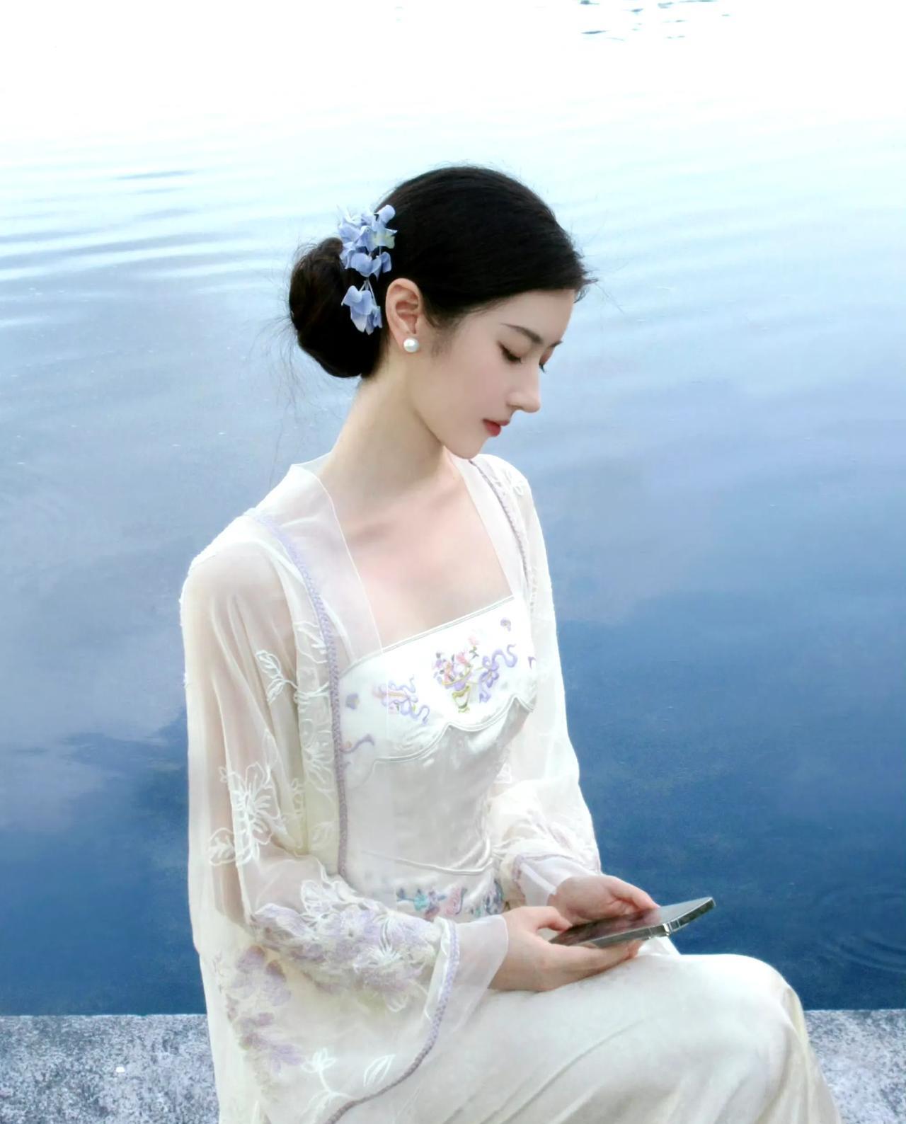 一位女子靠在栏杆上,身穿古装,气质优雅。
