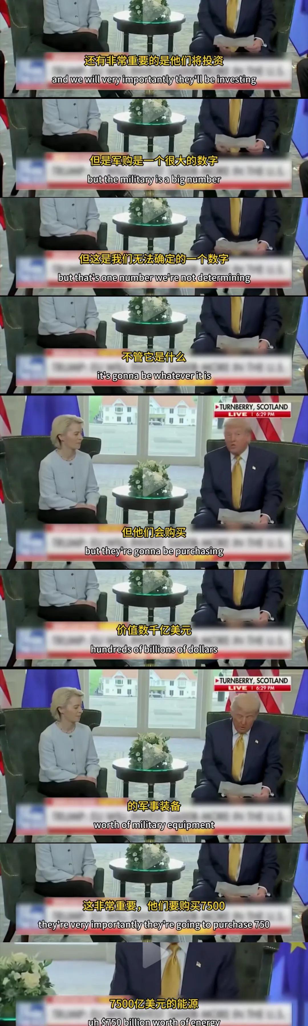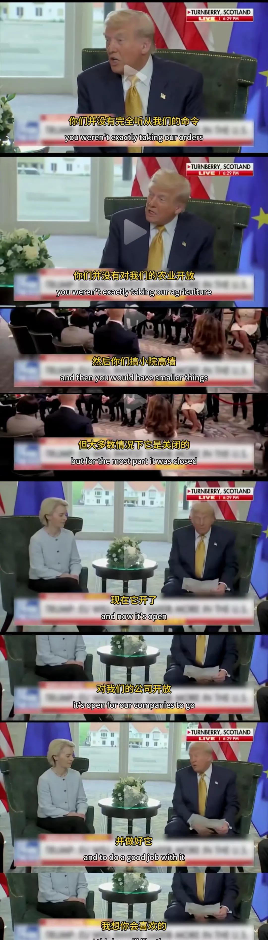 当着众多媒体和摄像机的面,特朗普声音洪亮地对到访美国的欧盟主席冯德莱恩宣布了从图1到图7他从她那里取得的“战果”。在这个过程中冯德莱恩始终像图8中那样双手放在腿上毕恭毕敬地听,直到特朗普宣布完毕她才如梦方醒,她没有任何反驳,而是用图9中“你可真是个不折不扣的谈判高手和交易达人。眼下这事……如果我们能搞定的话,这估计是咱们有史以来最大的一单。我已经很期待了……”这段话,默认了特朗普向她宣布的所有内容。 看了这个视频就一个感觉,如果在今天之前还在说日本首相石破茂向特朗普跪了,那现在的欧盟主席冯德莱恩则是匍匐在了特朗普脚下。 如果还有另一个感觉的话,那就是被驯服的狗永远都是狗。