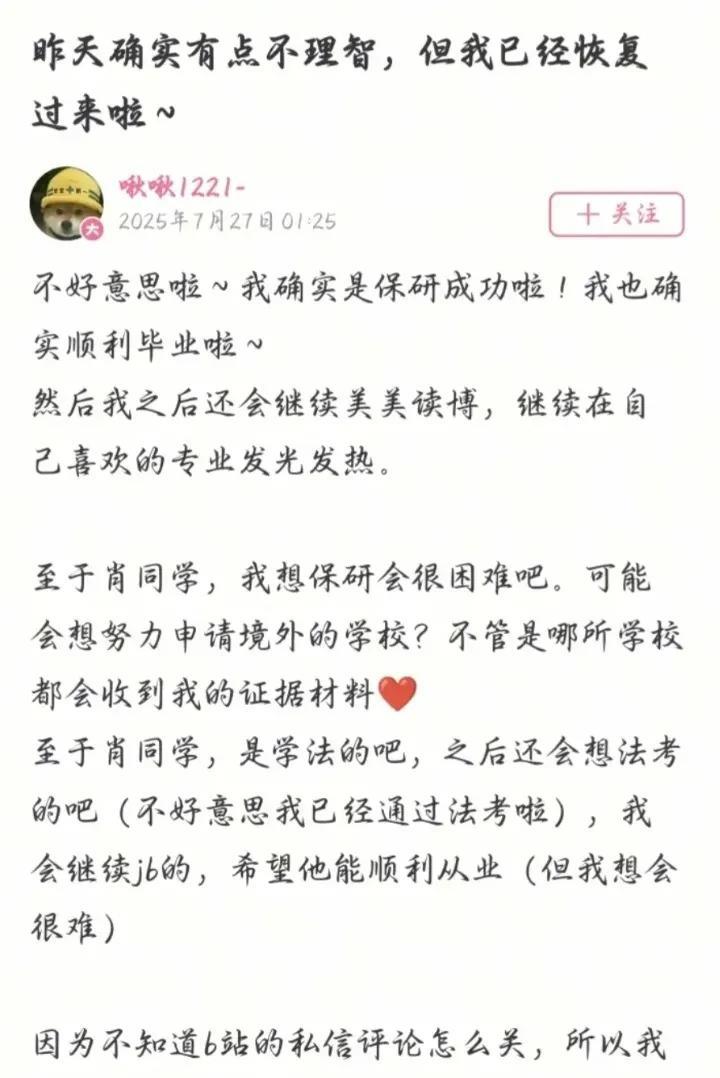 在杨同学的视频中,杨同学养了一条狗,还自称是小狗的姐姐,真不敢相信对一条小狗都如此有爱心的一个人,对自己的同学却如此残忍! 在杨同学的发文中,她不是考上的研究生,而是被武大保研成功!以后还打算读博士。 目前,杨同学在香港浸会大学就读,已被多人举报,其在武大诬陷他人,是否违反浸会大学校规? 武大对于杨同学未做任何处理,对于肖同学也未道歉。 看看津大的反应吧!如果津会大学将杨同学开除,武大再不做任何回应就说不过去了。 #武大性骚扰案#