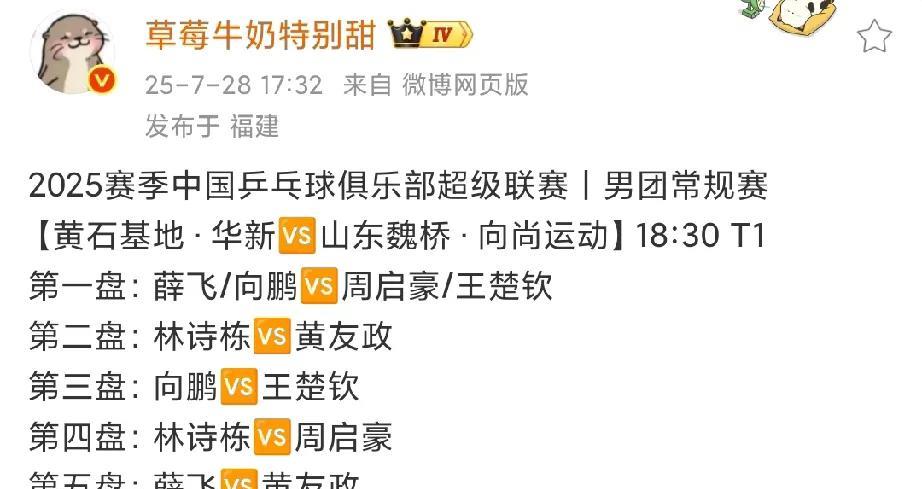 都在夸祖师爷排兵布阵 乒超联赛第二阶段今晚收尾, 山东魏桥收官之战, 即将对阵黄石基地·华新, 王楚钦作为魏桥三单, 和周启豪搭档男双, 也即将在第三盘与向鹏相遇, 意味着今年世界排名前十的选手, 王楚钦都对上了, 王楚钦承担了一双一单的角色, 大家是不是都很期待! 时间到, 运动员已经开始入场, 赛场内座无虚席, 比赛马上开始, 一起观赛, 评论区为运动员加油,播报战况!