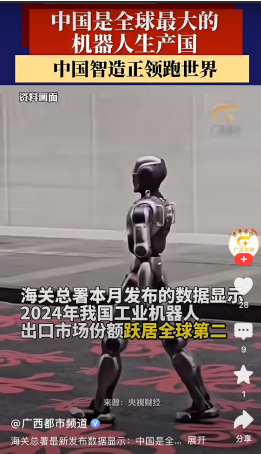 中国智造正领跑世界!近日,中国已超越美国成为全球最大的机器人市场和生产国,有望转变成最具创新力的机器人技术发展地。 最近这些年,中国在机器人这块儿的发展真是越来越猛,现在不光成了全球最大的机器人市场,连生产数量也超过了美国,说不准以后还能成最有创新力的机器人技术地呢。 2024年的时候,首届中国人形机器人产业大会发布了一份报告,里面说2025年咱们国家人形机器人的市场规模大概能有53亿元,等到2029年,可能就涨到750亿元了,到那时候能占全世界总量的三成多。 而且咱们国家已经连续 11 年都是全球最大的工业机器人市场,2024 年一年就生产了 55.6 万套工业机器人,比前一年多了 14.2%。再看企业数量,到2024年年底,全国有 45 万多家智能机器人产业企业,注册资本加起来有 6 万多亿元。 跟 2020 年底比,企业数量涨了两倍还多,就算跟 2023 年底比,也涨了快两成,这增长速度真是够快的,这么多企业扎堆做机器人,市场能不热闹吗? 现在机器人不光能听明白人的话,还能感知周围的环境,就跟长了眼睛耳朵似的,以前那些关键的零件,像减速器、控制器这些,咱们自己也能做得越来越好了。 不管是工厂里用的焊接、喷涂机器人,还是医院里用的手术、物流机器人,性能和安全程度都在不断提高,到 2024 年 7 月,咱们国家机器人相关的有效专利有 19 万多项,差不多占了全世界的三分之二。 产业能发展这么好,政策和资金也帮了大忙,2023 年 11 月,工信部发了个《人形机器人创新发展指导意见》,说要到 2025 年把人形机器人的创新体系搭起来,把关键技术攻下来,保证零件能供上。 重庆、深圳这些地方也跟着出台政策,支持企业研究相关技术,还给钱帮忙,投资方面就更不用说了,2025 年以来,机器人行业融资特别火,光 6 月之后,就有十多家做成人形机器人的企业拿到了上亿的投资。 好多投资机构都盯着这个领域,地方上也打算成立产业基金,引导更多钱投到机器人身上。从零件生产到机器人制造,再到后面的销售服务,整个产业链都挺完整的,大家各司其职,配合得还挺好。 机器人发展好了,对咱们普通人来说好处可不少,现在好多人家都有家政机器人了,扫地、拖地、擦窗户这些活儿,它们能干得明明白白,省得咱们自己费劲。 在医疗健康方面,机器人也派上了大用场,有些老人或者因为生病腿脚不方便的人,穿上外骨骼机器人就能慢慢锻炼走路。 重庆有个医疗科技公司做的外骨骼机器人,能通过传感器知道人想动,然后帮着使劲,让人走得更稳、更有劲儿。 平时想找点乐子,机器人也能陪着,现在好多年轻人喜欢 “遛机械犬”,在社交平台上这个话题的播放量都过亿了。 那些 AI 宠物就跟真的一样,能一直陪着人,帮着排解孤独,有个叫 “哮天” 的机器狗,才 850 克重,能听懂人的话,坐下、跳、跳舞都会,还能用手机、遥控器控制,玩着可有意思了。 其实在平时生活里,到处都能看到机器人的影子,去餐厅吃饭,经常能看到送餐机器人在桌子之间穿梭,把菜准确地送到客人面前,又快又新鲜。 住酒店的话,机器人可能会在门口迎接你,还能帮你送外卖,逛商场的时候,导购机器人能告诉你商品在哪儿,解答你的疑问,找东西方便多了。 工厂里就更不用说了,到处都是工业机器人在忙碌,搬运东西、分拣货物、检查产品质量、拧螺丝、装零件,这些活儿它们干起来又快又好。 宁波极氪的 5G 智慧工厂里,有个人形机器人,在工位上帮着工人搬东西,做得还挺像样,这在国内还是头一回。 煤矿里也用上了机器人,中信重工做的履带式辅助运输机器人和喷浆机器人,不用烧油,在那些又小又危险的地方也能干活,既减轻了工人的劳动强度,又提高了效率和安全性。 咱们国家的机器人产业真是越来越强了,不管是市场规模、技术水平,还是整个产业的生态,都在往上走。 这些机器人不光让工厂生产更有效率,也让咱们的生活越来越方便、越来越舒服,从家里的日常琐事,到医院的看病治疗,再到出门逛街、旅游,机器人都在悄悄帮着咱们。 以后随着技术越来越进步,机器人肯定还会在更多地方发挥作用,让咱们的日子过得更滋润。 说不定再过几年,咱们的生活里到处都是机器人的身影,那时候又会是啥样呢?