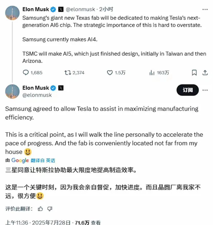 特斯拉的车载芯片, 上一代AI4是三星代工的。 目前这一代AI5是台积电代工的。 下一代AI6又会让三星代工。 马斯克还发帖说,他要亲自监督生产。 哈哈哈哈哈哈 马监工正式登场。