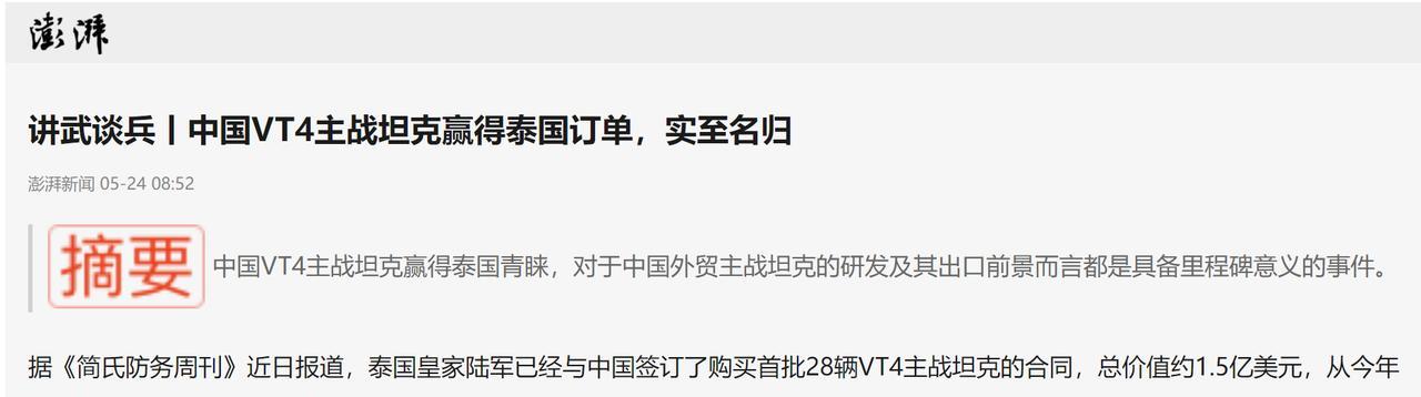 泰国方面消息称,从中国采购的VT-4坦克从第一天起就进入了作战区域,并帮助陆军步兵部队从柬埔寨夺回了几个重要阵地,而没有任何损伤报告。 其实泰国当初选坦克的时候,一开始瞅上乌克兰的T-84,觉得那型号在国际上有点名气,价格也不算顶贵,于是打算订个200辆。 可乌克兰那边不争气,交付日期一拖再拖,别说200辆的大订单了,连零星几辆都凑不齐。 泰国陆军等着装备换新,眼瞅着边境局势不太平,哪耗得起这功夫?这时候中国的VT-4慢慢走进了泰国军方的视野。 泰国把第一批VT-4拉到第二军区的时候,正好赶上跟柬埔寨在边境较劲。有次泰军要收复一处被占的高地,柬埔寨那边派了三辆T-55守着,炮口对着必经之路。 VT-4一上去,没等对方炮手看清影子,先靠热成像锁定了位置,两炮过去就废了两辆T-55,剩下那辆想掉头跑,被VT-4的同轴机枪追着打,最后卡在山沟里动弹不得。 泰军步兵跟在后面冲锋,几乎没受什么阻力就拿了下来,全程VT-4没出过一次故障,更别说损伤了,泰国士兵现在见了这坦克,眼神里都带着信服。 要知道VT-4动力系统用的是1200马力的发动机,跑起来在东南亚的雨林地形里跟平地似的,转弯、爬坡都利索。 125毫米滑膛炮配上自动装弹机,射速比人工装填快一倍还多,穿甲弹打出去能轻松撕开T-55那种老古董的装甲。 更关键的是火控系统,热成像仪夜里看几公里外的目标跟看自家院子似的,激光测距仪一锁定,炮弹出去就没跑,这在复杂地形里简直是"开了挂"。 柬埔寨那边的主力还是T-55,这坦克说起来都是爷爷辈的了,上世纪五十年代的技术,正面装甲最厚的地方也就两百毫米,遇上VT-4的穿甲弹,跟纸糊的差不多。 更要命的是T-55的火控,全靠炮手肉眼瞅,标尺量,打移动目标跟蒙眼扔石头似的,而VT-4的电子火控系统,就算坦克在颠簸中跑,炮弹也能稳稳扎进目标。 这事儿说到底,还是武器装备得跟得上时代,柬埔寨不是不想换装备,可军费就那么点,能凑齐T-55维持基本防御就不错了,哪有闲钱搞信息化、电子化升级。 而VT-4之所以能站稳脚跟,靠的就是把火力、防护、机动这老三样,跟现代电子技术捏合得恰到好处,既不会复杂到让士兵玩不转,又能实实在在提升战斗力。 泰国选它的时候,肯定也算过这笔账,买一堆不靠谱的"名气货",不如踏踏实实搞点能立刻派上用场的硬家伙。 从这里也能看出来,中国武器这些年在国际市场上能打开局面,不是靠吹出来的。 就像VT-4,从设计到生产,全程都是按实战需求来的,客户要什么功能就给什么,售后服务也跟得上,不像有些国家卖装备还附带一堆政治条件。 泰国用着顺手,自然会接着买,说不定以后还会推荐给其他国家。这种靠实力说话的路子,比任何宣传都管用。 现在边境上,VT-4的身影越来越多,柬埔寨那边估计也明白,再靠老掉牙的T-55硬扛不是办法。