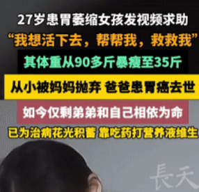 我想活下去!一27岁女生从小被母亲抛弃,几年前父亲也因病去世,留下她和弟弟相依为命,而亲人的离世,也让她得了抑郁症以及胃萎缩,体重暴瘦至30多斤,只能靠输营养液维持,可积蓄早已花光,走投无路之下,只好发视频求助好心人。 据长天新闻7月28日的报道,女生的不幸还要从童年说起,在其很小的时候,母亲就狠心抛弃了这个家庭,留下她和弟弟由父亲独自抚养。 父亲是个老实巴交的工人,靠着微薄的收入拉扯两个孩子长大,日子虽然清苦,但好歹是个完整的家。 然而命运并没有放过这个脆弱的家庭,几年前父亲被确诊为胃癌晚期,很快就撒手人寰,留下姐弟俩相依为命。 接连的打击,让她患上了严重的抑郁症,整日以泪洗面,吃不下饭,睡不着觉,长期的营养不良和精神压力,最终导致了胃功能的全面衰退。 最终诊断她患上了严重的胃萎缩,这种疾病让她的胃几乎丧失了消化功能,让她的身体在以肉眼可见的速度垮掉。 为了治病,女生花光了家里所有的积蓄,还欠下了不少外债,弟弟刚刚成年,能做的实在有限。 现在的治疗费用对他们来说,就像个无底洞,每天仅白蛋白营养液就要不少的钱,她在病床上录制的求助视频里,虚弱地说:“我想活下去,帮帮我”。 而女生的遭遇引发了广泛关注,也有很多好心人愿意伸出援手,但治疗费用仍然是个天文数字。 看看她的遭遇,再想想我们身边那些为了一点小事就抱怨的人,真是天壤之别,这个姑娘面对的不仅仅是疾病的折磨,还有经济上的绝望。 为治病花光了钱,弟弟年纪还小,她能依靠的只有社会的善意,可即便如此,她依然在努力活着,这份坚韧让人动容。 最后则真心的希望,这位女生能够早日康复,不再免受病痛的折磨,能和弟弟过上正常的生活。 那么对于这件事情,您有什么想说的呢?