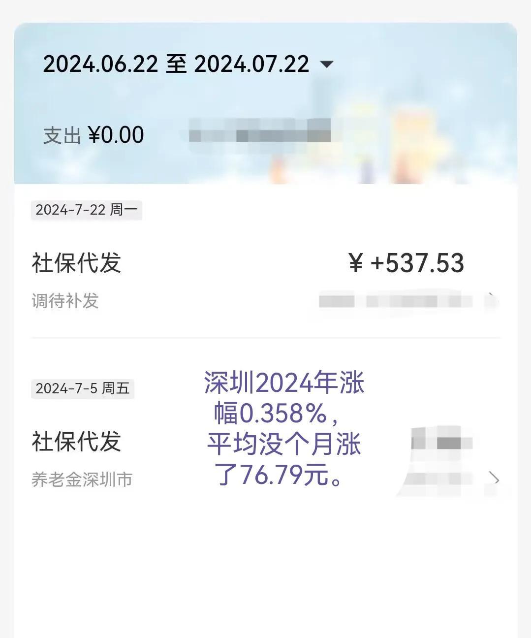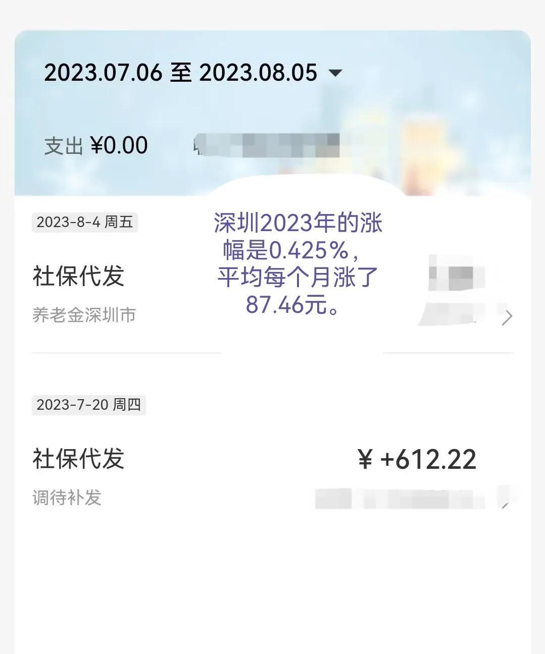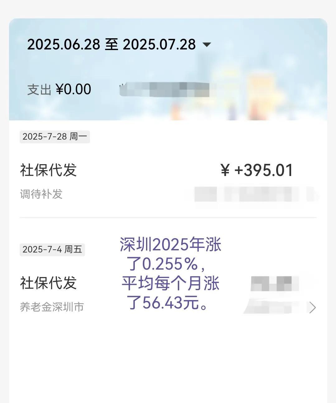 坐标深圳 一年一次的养老金调整补发,千呼万唤始出来,大家期待的是一年更比一年好,实际情况是一年更比一年少。 我是2022年8月份退休的,当年退休金到手是1987元,当年调整补发了252元,平均每个月就有2050元。 2023年7月调整补发612.22元,平均到七个月,每个月增加了87.46元,涨幅是0.425%。 2024年7月调整补发了537.53元,平均到七个月,每个月增加了76.79元,涨幅是0.358%。 2025年7月调整补发今天晚上刚刚到账,一共补发了395.01元,平均到七个月,每个月增加了56.43元,涨幅是0.255%。 #晒图笔记大赛#