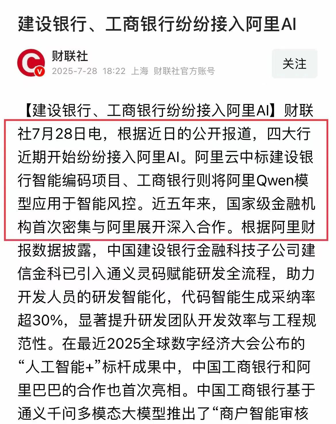 风向彻底变了,八月前夕国内传出一条重磅消息,释放了两个重要信号! 今天看到一则消息,中国建设银行和中国工商银行都选择了和阿里云合作,将旗下核心业务接入通义大模型。 这个消息就很不简单,很容易得出两个结论: 第一,阿里通义千问的技术能力过硬。银行属于金融行业,像建设银行、工商银行这样的国有银行,更是国家经济的命脉。 在金融行业,对于技术的要求和审核标准都会比普通行业更加高,安全性、稳定性、可靠性都是必须过关才行。 而随着建设银行和工商银行接连接入阿里通义千问,就说明在技术方面,阿里绝对是过硬的。 这一点其实也不用质疑,目前阿里通义千问是世界第一的开源大模型,全球开源模型超300款,衍生模型数量超14万个。 近期阿里一周时间内开源了四个大模型,结果全部拿下全球开源冠军,毫不客气的说,阿里的AI实力已经是全球顶尖的。 第二,国家对于阿里技术是很有信任感的。中国建设银行和中国工商银行是国内四大行,属于央企。 对于这样的机构而言,光是技术强大还不够,最关键的还是得值得信任,毕竟里面可能涉及一些国家机密,如果不是信得过的人,估计不可能可以取得合作。 所以这种情况下,咱们不可能去选择国外的AI,只能用咱们自研的,并且是最好的AI。 而在这种情况下,阿里通义千问无疑是最好的选择,因为阿里通义千问不但技术强大,并且是国内企业使用最多的大模型。 像小鹏、小米、国家天文台、中国移动等等,众多的中国企业和机构,都和阿里有合作,可以说经过验证的。 不得不说,四大行首次和阿里技术合作,释放的信号很强烈了,说明咱们国内已经有了值得信赖,并且技术强大能够扛大旗的企业,中国自研技术再次得到了肯定!