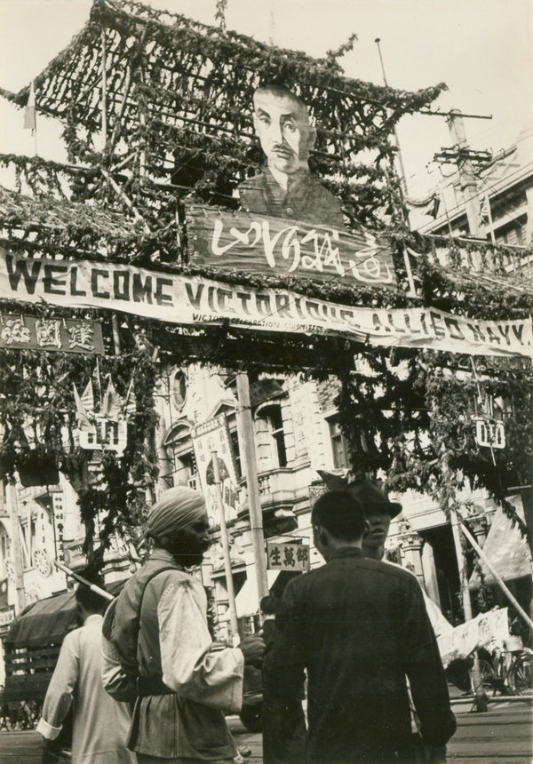 英国帝国战争博物馆收藏的两幅绘画作品,1945年10月英国皇家海军陆战队参加在上海举行的抗战胜利庆典,作者是吉姆·莫里斯。 据说两幅画都是表现的南京路上的游行场景,第一幅是南京路与浙江路的交叉口,第二幅是南京路与西藏路的交叉口。但显然这个画家不懂中文,他照葫芦画瓢抄下的文字让我这个中国人都看不懂,传递的信息不免大打折扣。 看来英国人也明白这一点,由摄影师乔治·拉克斯拍摄了对应的照片进行比较。牌坊上的字应该是还我河山,可人是谁呢?应该不是常凯申吧,我认识他挺久了,他不长那样啊。
