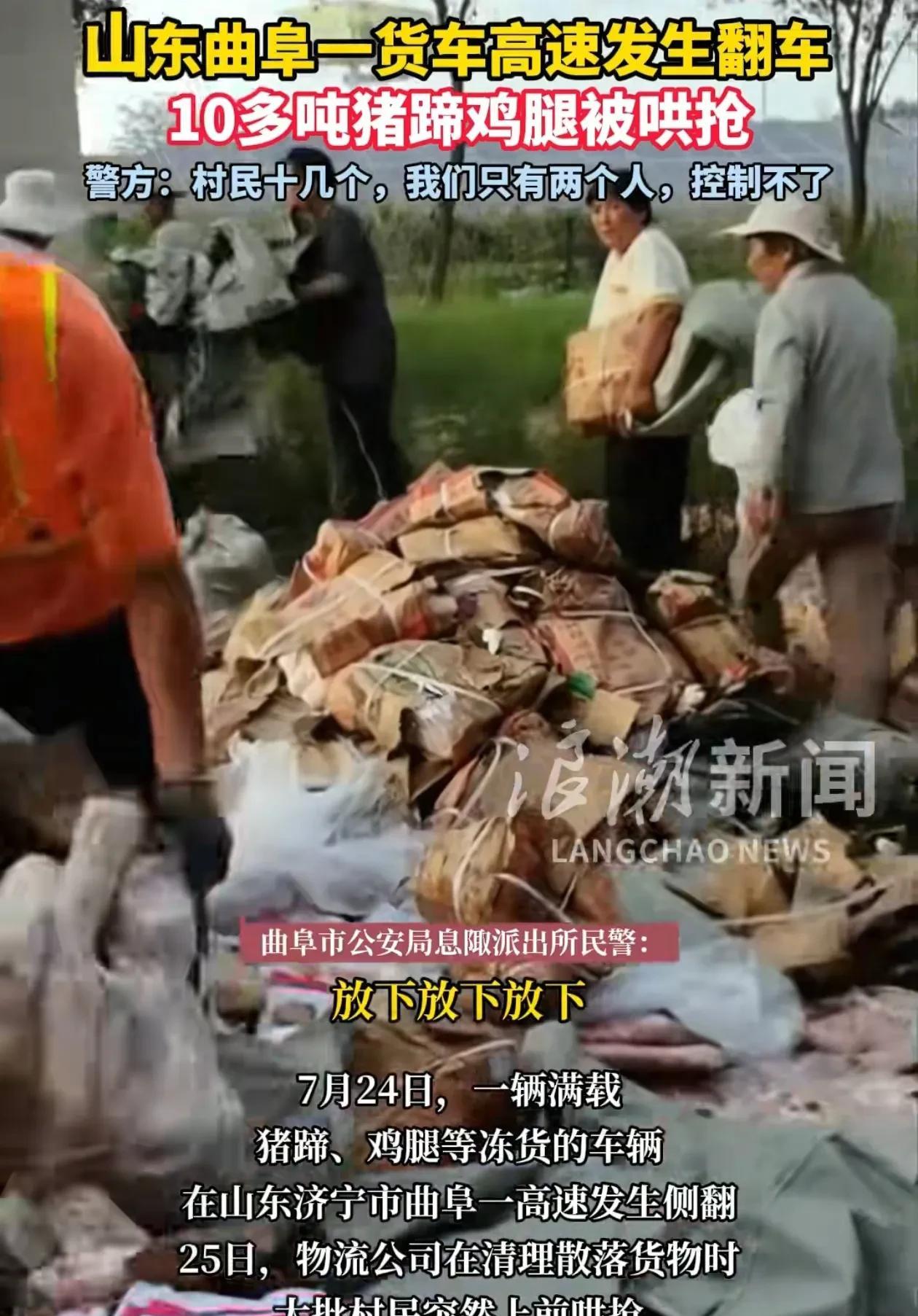 本以为是“好客山东 孔孟之乡”,结果这下真的解释不清楚了!近日,山东曲阜一货车在高速上侧翻,车上拉的都是猪蹄、鸡爪、巧克力、小酥肉等食物,结果被当地村民捡走了近一半的货物,货主说损失约40万! 货主说谁也不想发生这样的意外,而且司机和他老婆都受伤了,一直向他道歉说对不起,他也不忍心再去责怪司机,但一定会向参与了哄抢货物的村民追究损失的。 刚开始,物流公司还在清理货物,但因为人手不足,只能慢慢搬,村民也只是在旁边围观,后来到了下午6点,突然就全部围上去拿了。 有村民看到有警察来了也不怕,只是抬头看了一眼,就继续用口袋装东西,估计在大妈看来,虽然不是她的东西,但是大家都在捡,她不拿就吃亏了! 真的太丢人了,司机已经够可怜的,不帮你就算了,难道就缺那点吃的!