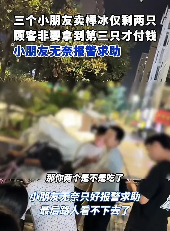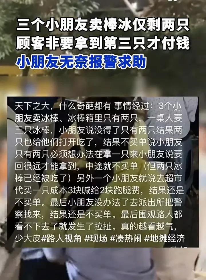 连孩子的钱都骗,这种人真是没良心!7月27日,贵州三个孩子利用暑假卖冰棒,一位顾客过来想要买三支冰棒,但三个孩子解释只剩下两支冰棒,于是顾客就先吃完了两支,但却不肯付钱,坚持要拿到第三支冰棒才肯付,三个孩子无奈报警。